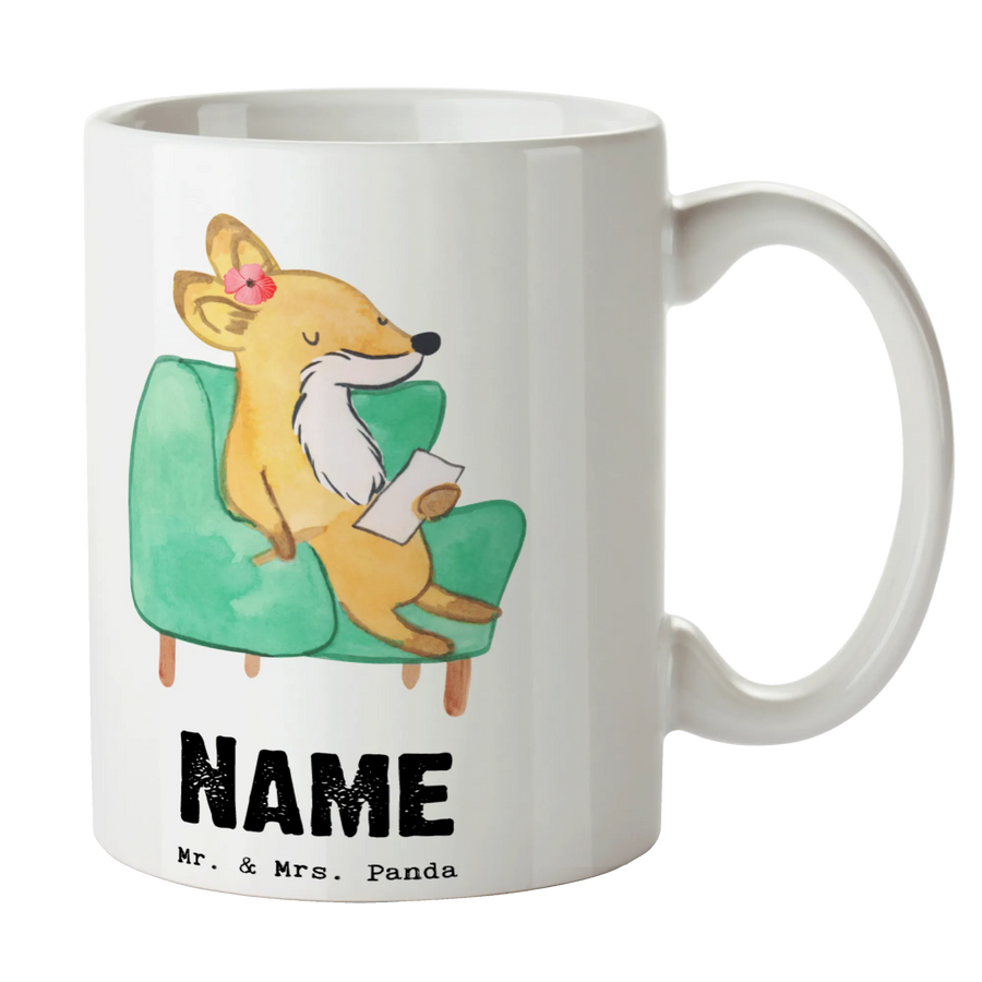 Egal, ob zum Berufsstart, zur Beförderung, zum Jubiläum oder zum Abschied – diese Tasse versprüht bei jeder Gelegenheit Freude! Mit einem süßen, handgezeichneten Motiv eines aufmerksamen Fuchses, der auf einem Ohrensessel sitzt, spricht sie die Herzen aller an, die in der Therapie arbeiten.