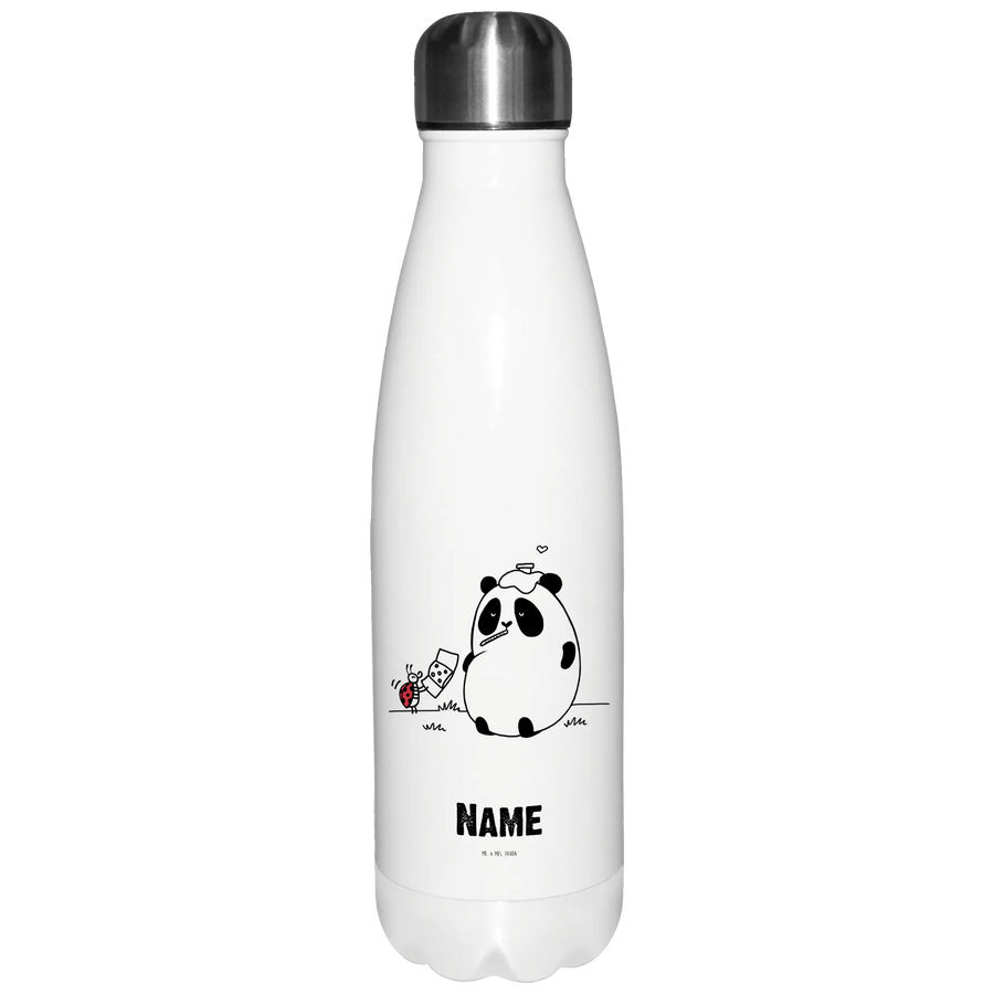 Diese einzigartige Trinkflasche wird mit einem süßen Design bedruckt, das einen kleinen erkälteten Panda zeigt, der mit einem Thermometer im Mund auf einer Wiese sitzt. Sein kleiner Marienkäferfreund bringt ihm ein Pflaster und zusammen drücken sie eine Botschaft aus, die auf jedem Farbtropfen aufleuchtet: "Gute Besserung!"