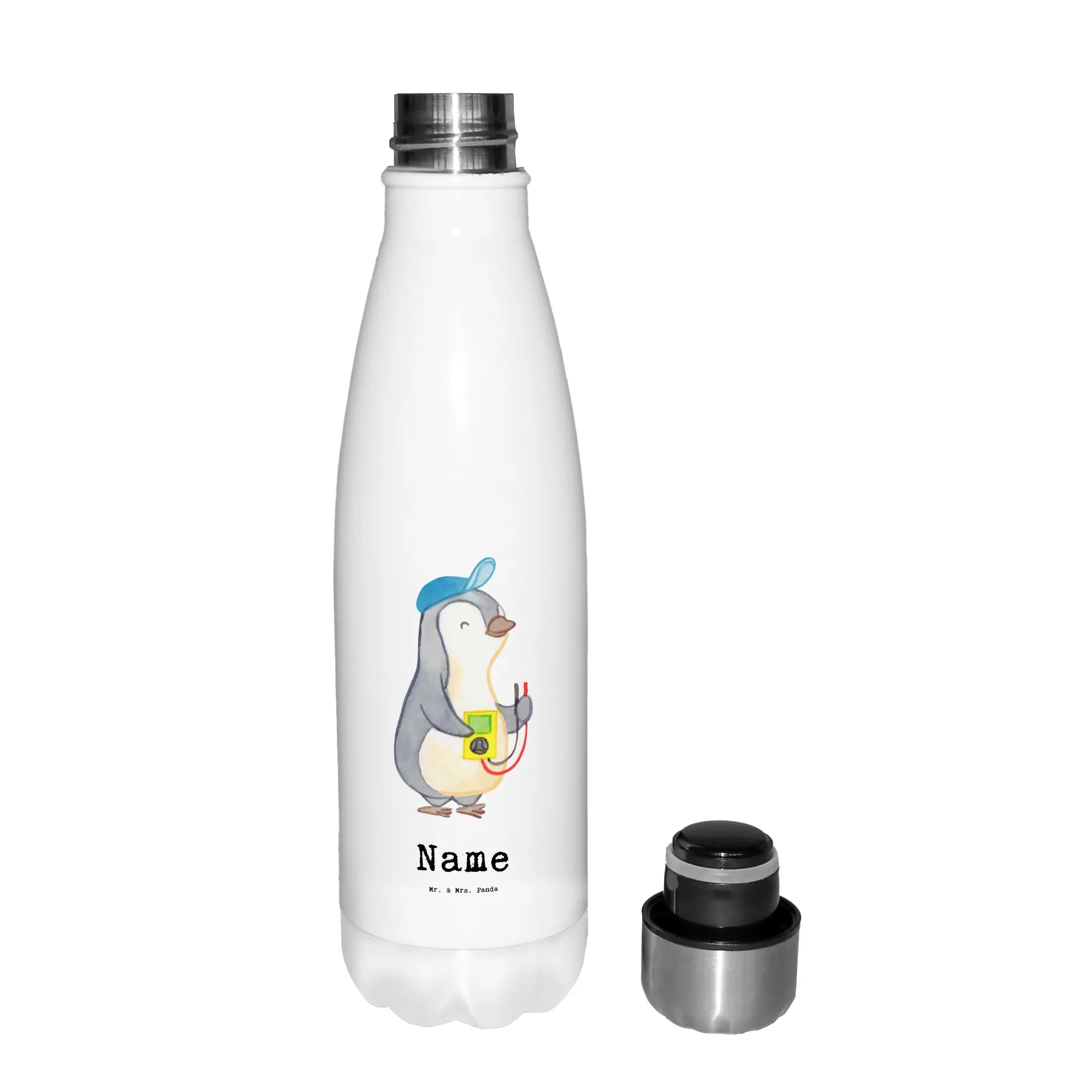 Die personalisierte Thermosflasche "Elektriker mit Herz" von Mr. & Mrs. Panda ist das perfekte Geschenk für alle, die in der Elektrobranche arbeiten. Ob zur Gesellenprüfung, zum Berufsabschluss oder als Dankeschön für einen geschätzten Kollegen – diese Flasche ist ein ideales Präsent!