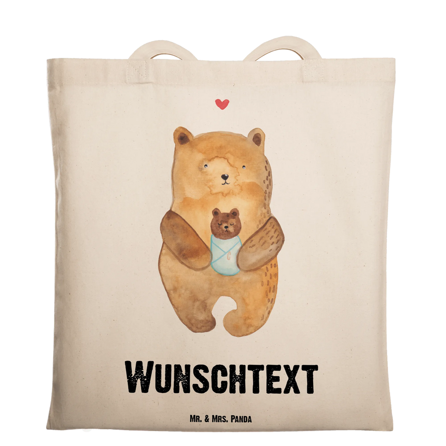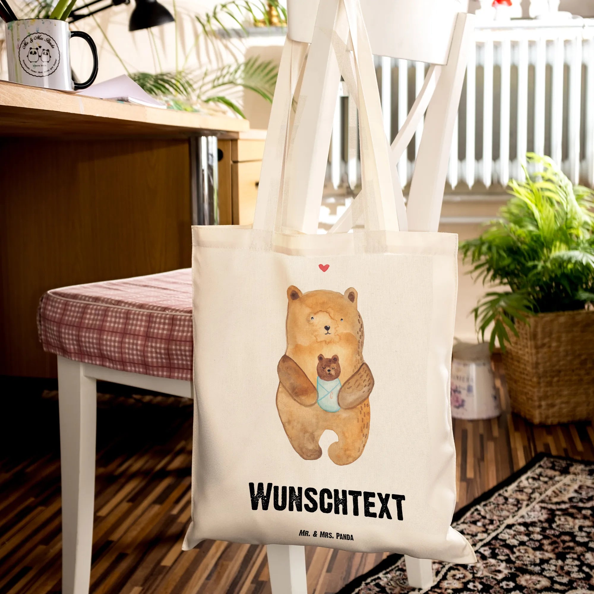 Entdecke unsere liebevoll gestaltete personalisierte Tragetasche mit dem zauberhaften Motiv "Bär mit Baby" aus der Bären-Kollektion von Mr. & Mrs. Panda!