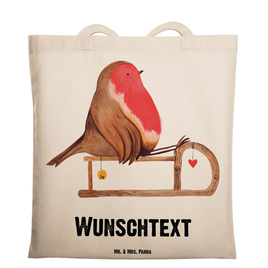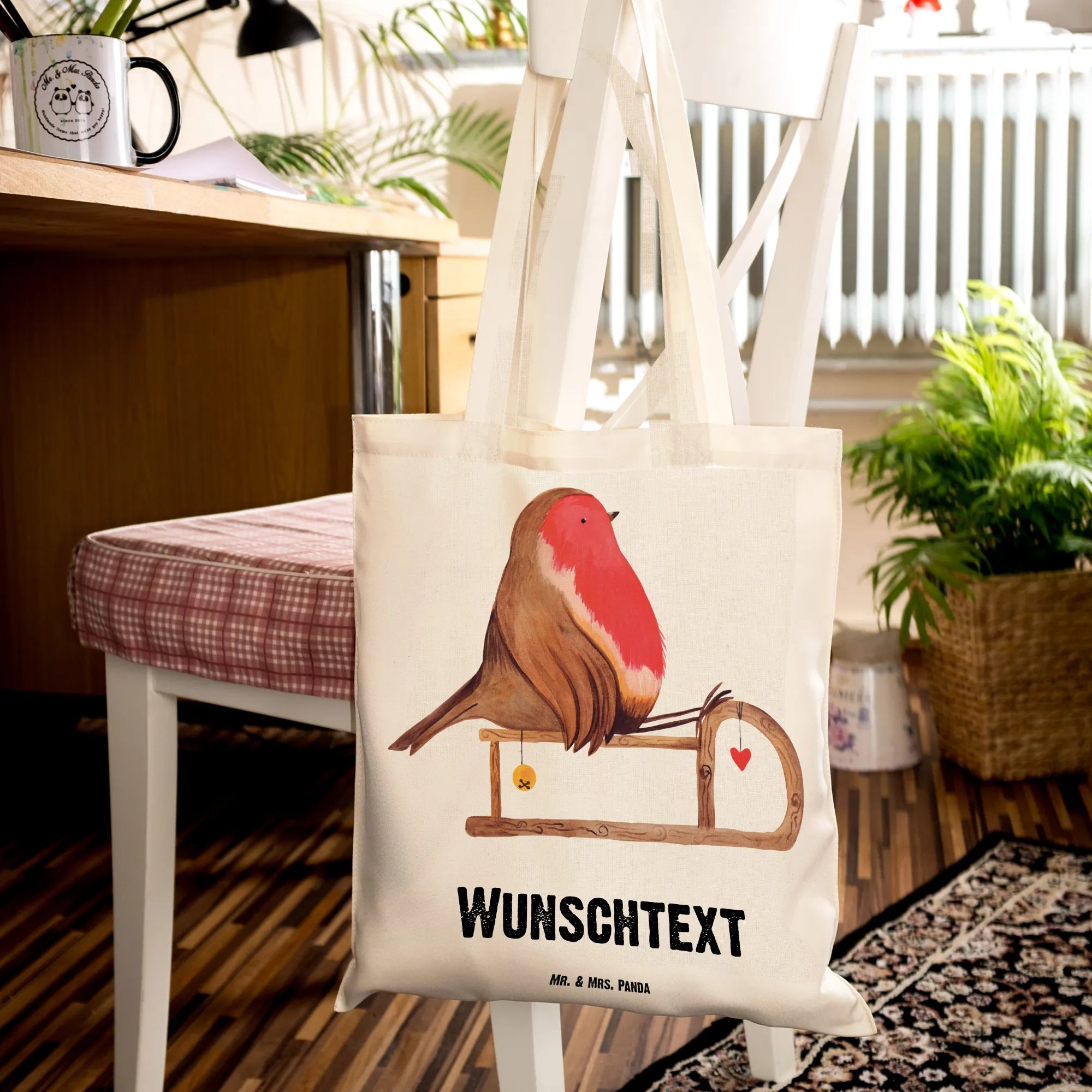Das liebevoll von Mrs. Panda handgezeichnete Motiv mit dem fröhlichen Rotkehlchen auf seinem Holzschlitten zaubert dir und jedem, dem du diese Tasche schenkst, ein Lächeln ins Gesicht. Die personalisierte Tragetasche eignet sich hervorragend als Geschenk zu Weihnachten, zum Nikolaus oder einfach als kleine Aufmerksamkeit für Freunde und Familie. Denn mit der Möglichkeit, die Tasche mit einem Namen oder Wunschtext zu personalisieren, wird jede Tasche zu einem Unikat!