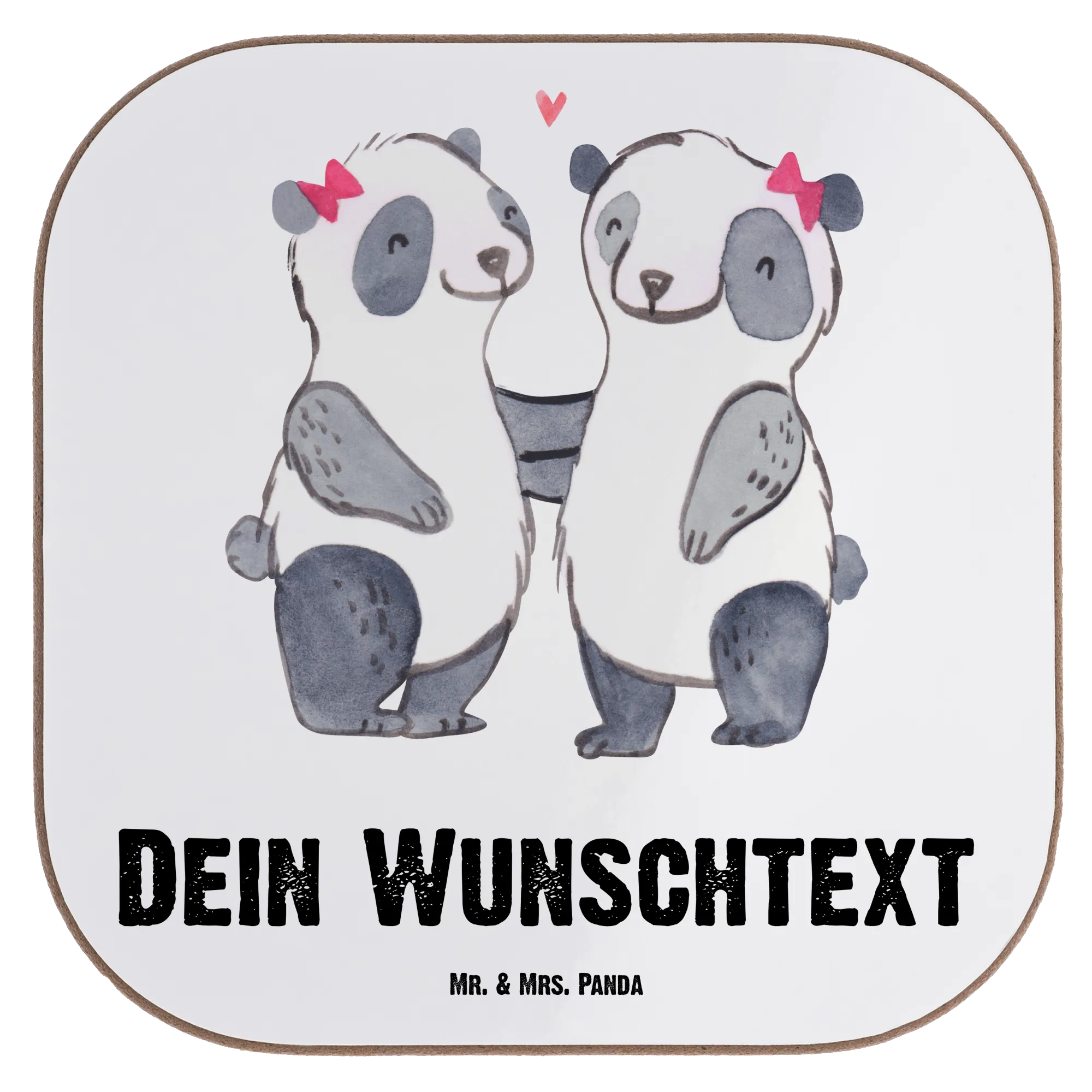 Dieser Untersetzer wird mit einem zauberhaften Motiv und einem liebevollen Spruch bedruckt. Zwei süße Pandas halten sich an den Händen, und dazu steht der herzliche Text: "Beste Schwester der Welt".