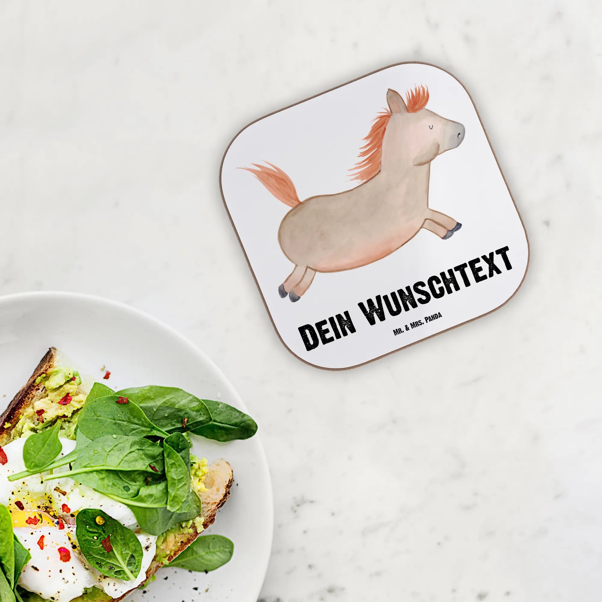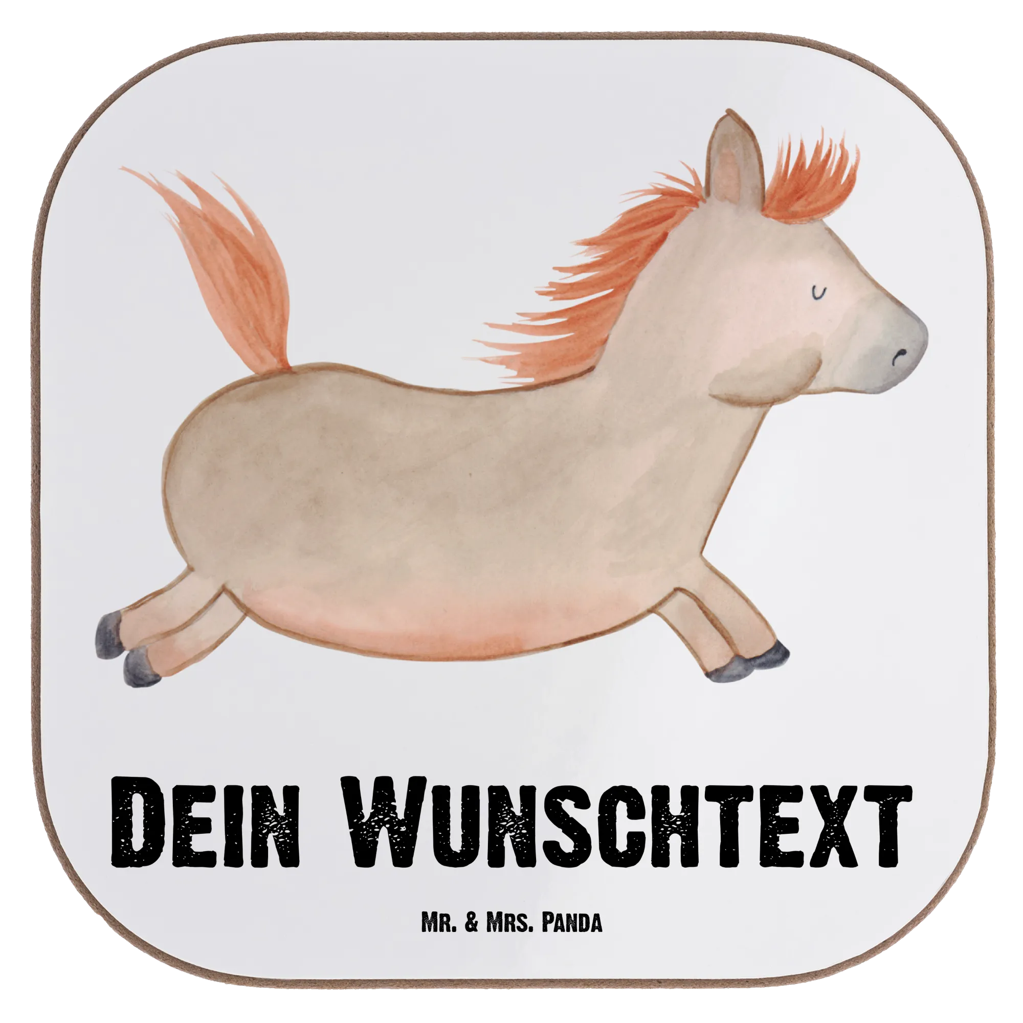 Ein wunderschöner personalisierter quadratischer Untersetzer von Mr. & Mrs. Panda mit dem niedlichen Motiv "Pferd springt", speziell designed für alle Pferdeliebhaber und Pferdebesitzer. Dieser Untersetzer bringt nicht nur eine persönliche Note in dein Zuhause, sondern schützt deinen Tisch auch vor Abdrücken, Kratzern und extremen Temperaturen.