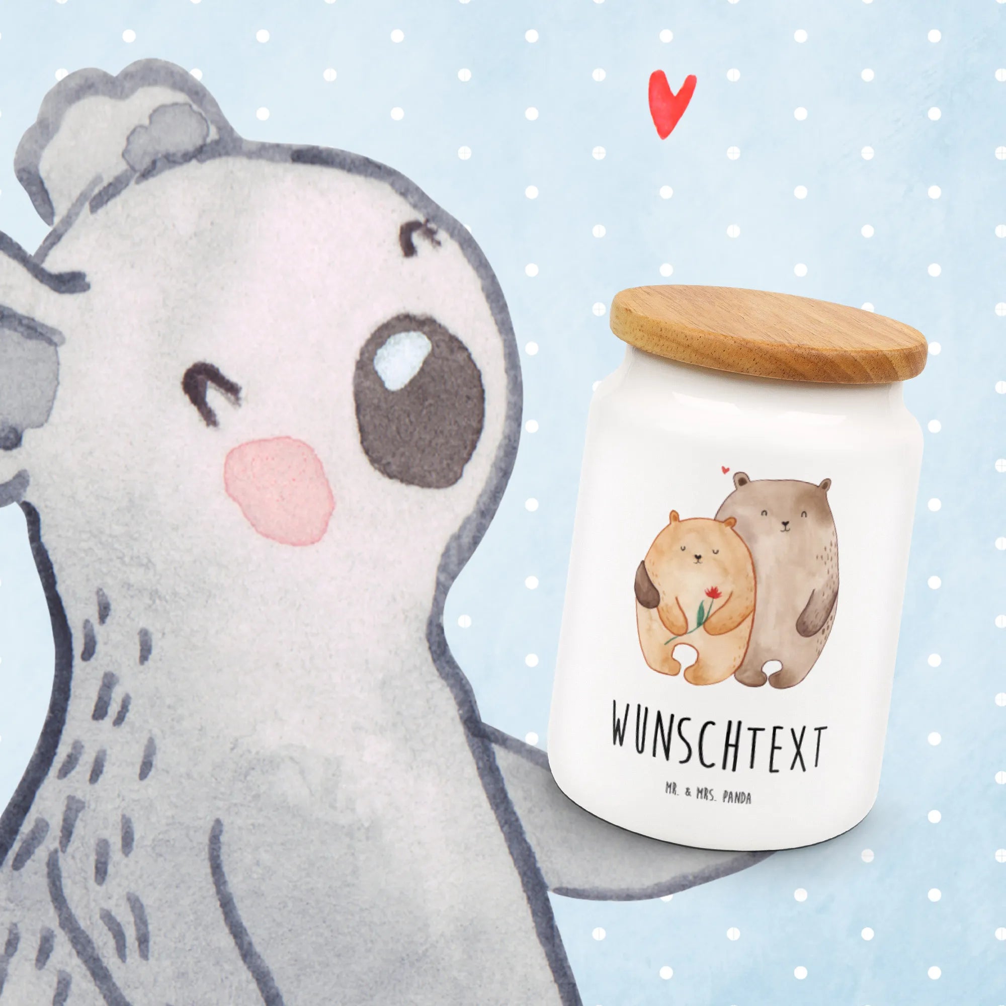 Die personalisierte Vorratsdose mit dem bezaubernden Motiv "Bären Liebe" von Mr. & Mrs. Panda ist das perfekte Geschenk für alle, die ihre Liebe auf kreative Weise ausdrücken möchten. Sie ist nicht nur ein schöner dekorativer Gegenstand, sondern auch äußerst praktisch für die Aufbewahrung von Keksen, Leckereien oder sogar kleine Dinge im Alltag.