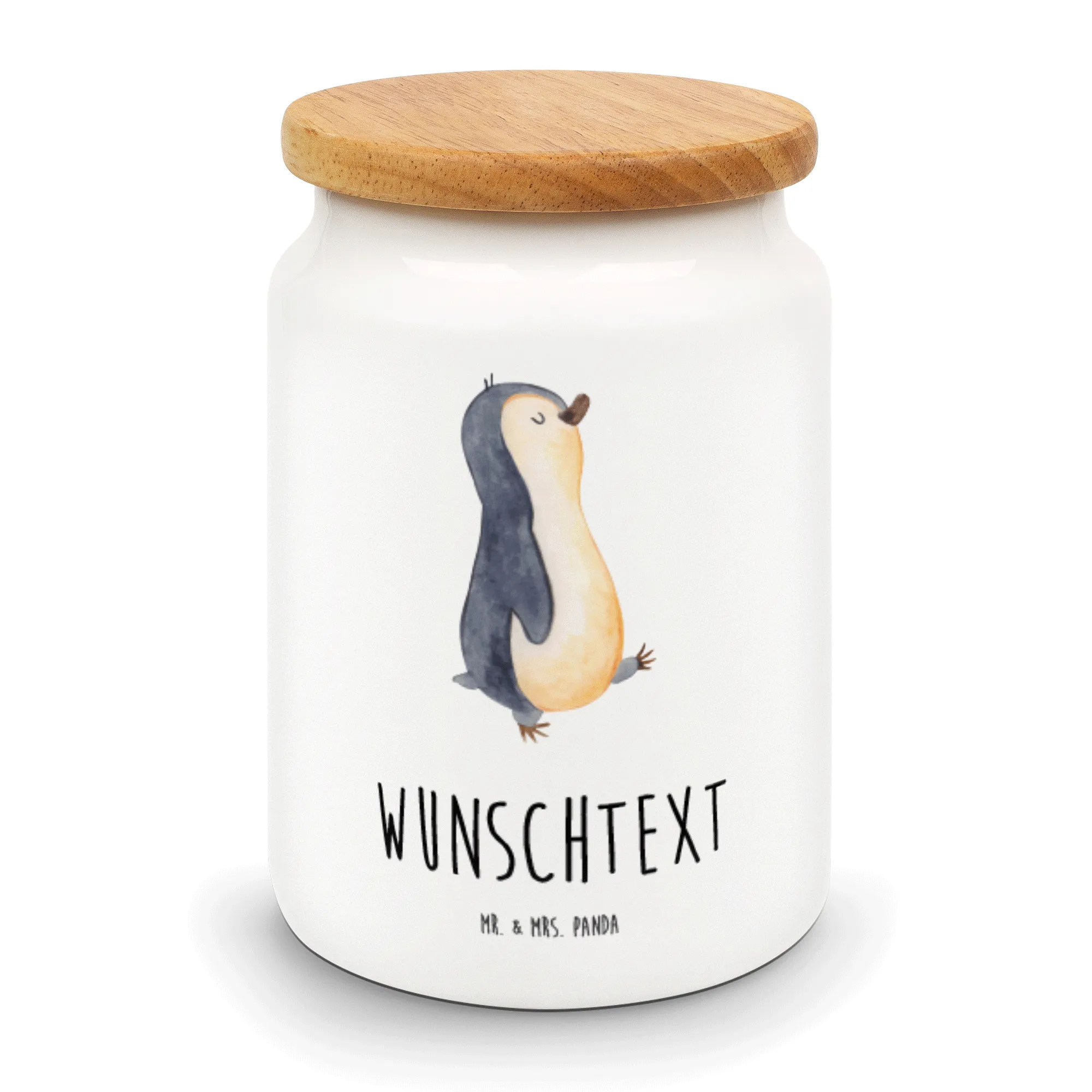 Die personalisierte Vorratsdose Pinguin marschierend von Mr. & Mrs. Panda ist nicht nur ein praktisches Haushaltsaccessoire, sondern auch ein hübsches Geschenk für alle Pinguin-Liebhaber. Diese Dose aus hochwertiger Keramik bietet mit einer Füllmenge von 650 ml genügend Platz für Kekse, Snacks oder Schokolade.