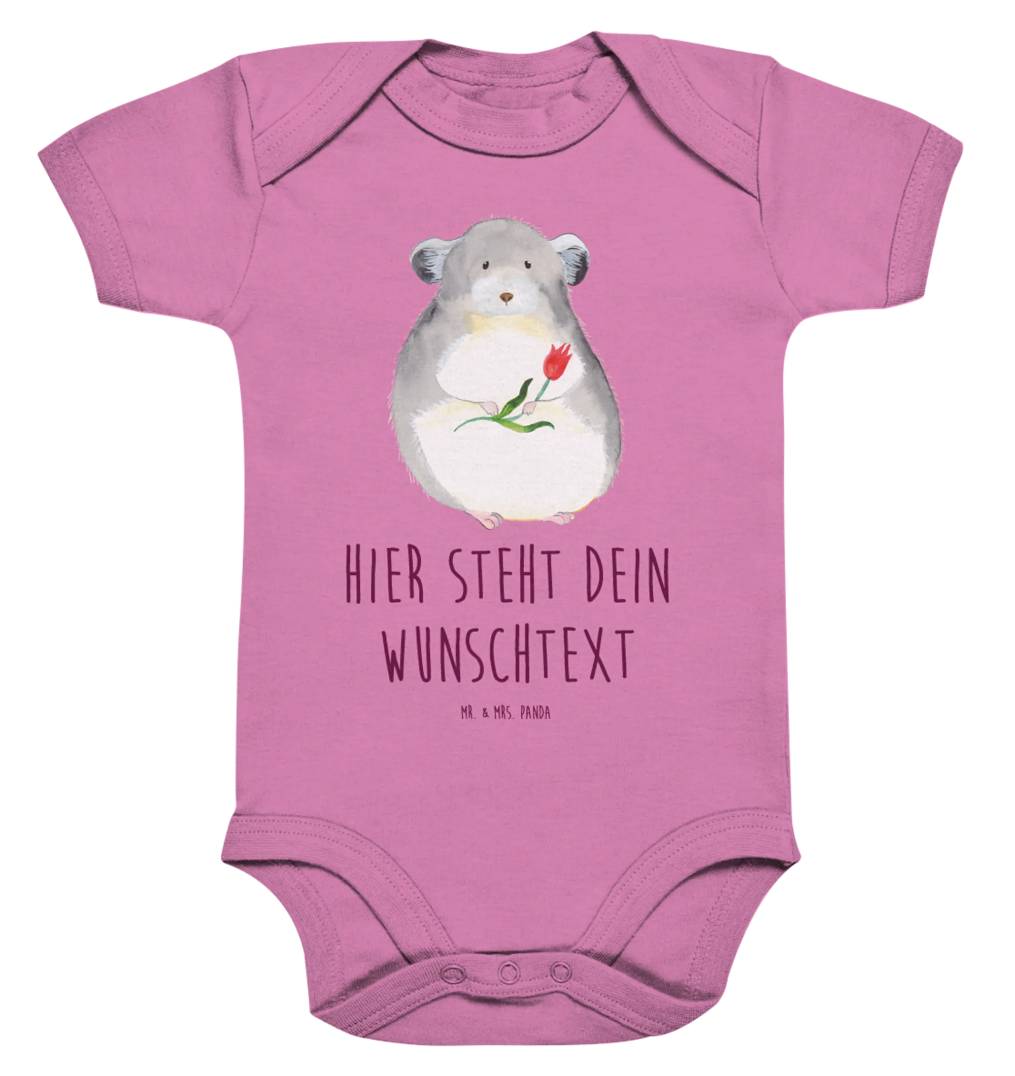Der personalisierte Baby Body "Chinchilla mit Blume" aus der zauberhaften Small World Kollektion von Mr. & Mrs. Panda ist das perfekte Geschenk für frischgebackene Eltern und ihre kleinen Lieblinge! Du kannst dich dem niedlichen Chinchilla nicht entziehen, das dich mit großen Augen und einem Blumenstrauß in der Hand anschaut. Es strahlt pure Herzenswärme aus und jeder, der das Design sieht, wird sofort lächeln. Dieses schicke und gemütliche Kleidungsstück aus 100% Öko-Baumwolle ist nicht nur bequem, sondern auch umweltfreundlich!