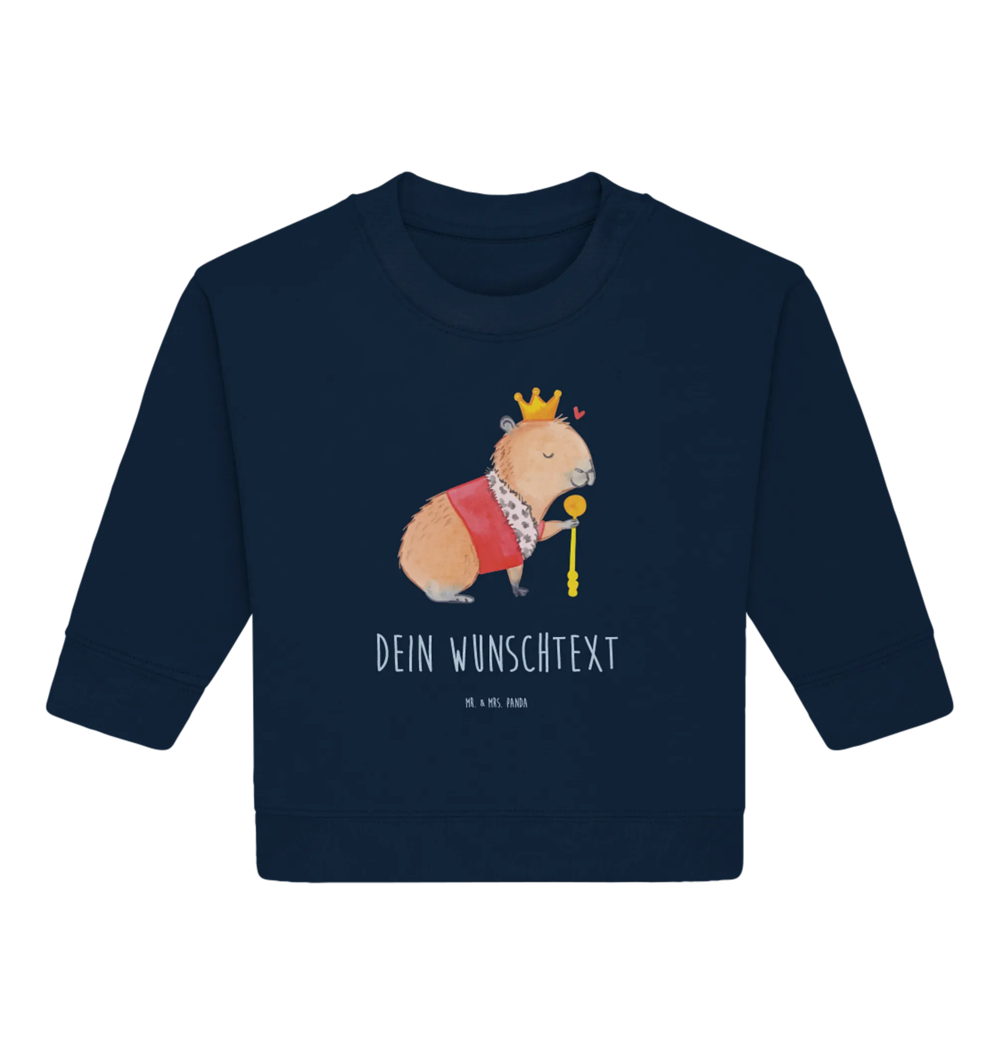 Entdecke den perfekten personalisierten Baby Pullover mit unserem bezaubernden Capybara König Motiv aus der Small World Kollektion von Mr. & Mrs. Panda! Dieser Pullover ist nicht nur ein warmes Kleidungsstück, sondern auch ein einzigartiges Geschenk für kleine Wunder. Das handgezeichnete Design von Mrs. Panda zeigt ein niedliches Capybara, das mit einer goldenen Krone und einem purpurroten Mantel auf liebevolle Weise über sein kleines Königreich herrscht. Mit seinem goldenen Zepter und dem zufriedenen Ausdruck im Gesicht strahlt es eine unwiderstehliche Freundlichkeit aus. Das kleine Herzchen über seinem Kopf macht das Bild noch perfekter und sorgt für gute Laune.
