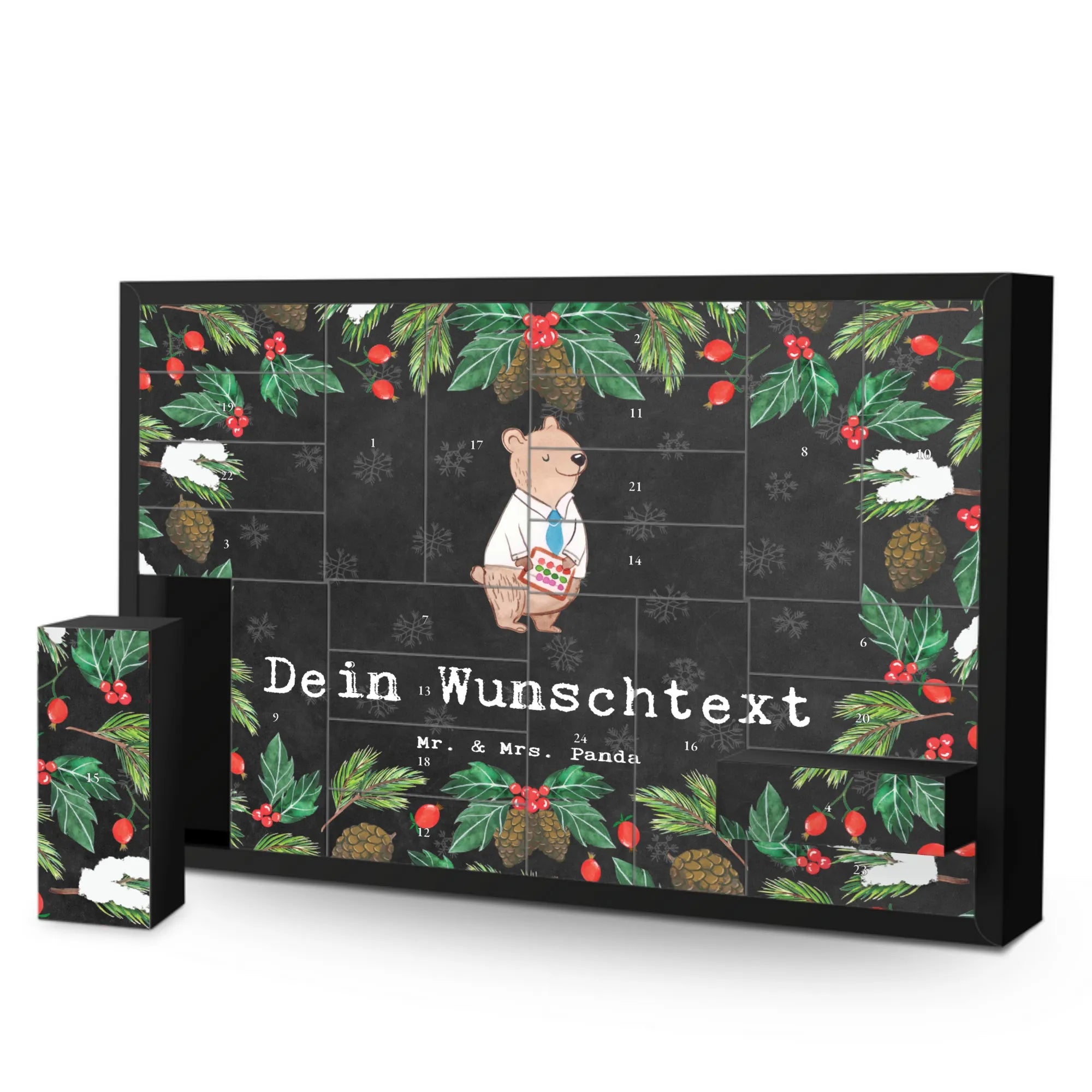 Mit 24 kleinen Schachteln kannst du ihn nach Herzenslust befüllen und damit die Vorweihnachtszeit verschönern. Die Vorderseite des Kalenders zeigt eine liebevolle Zeichnung von Mrs. Panda, die einen Bären darstellt, der als fähiger Bankangestellter brilliert. Mit einem Rechenschieber in der Hand vermittelt er Vertrauen und Kompetenz. Diese Illustration sorgt nicht nur für ein Lächeln, sondern erinnert auch an die Leidenschaft für den Beruf.