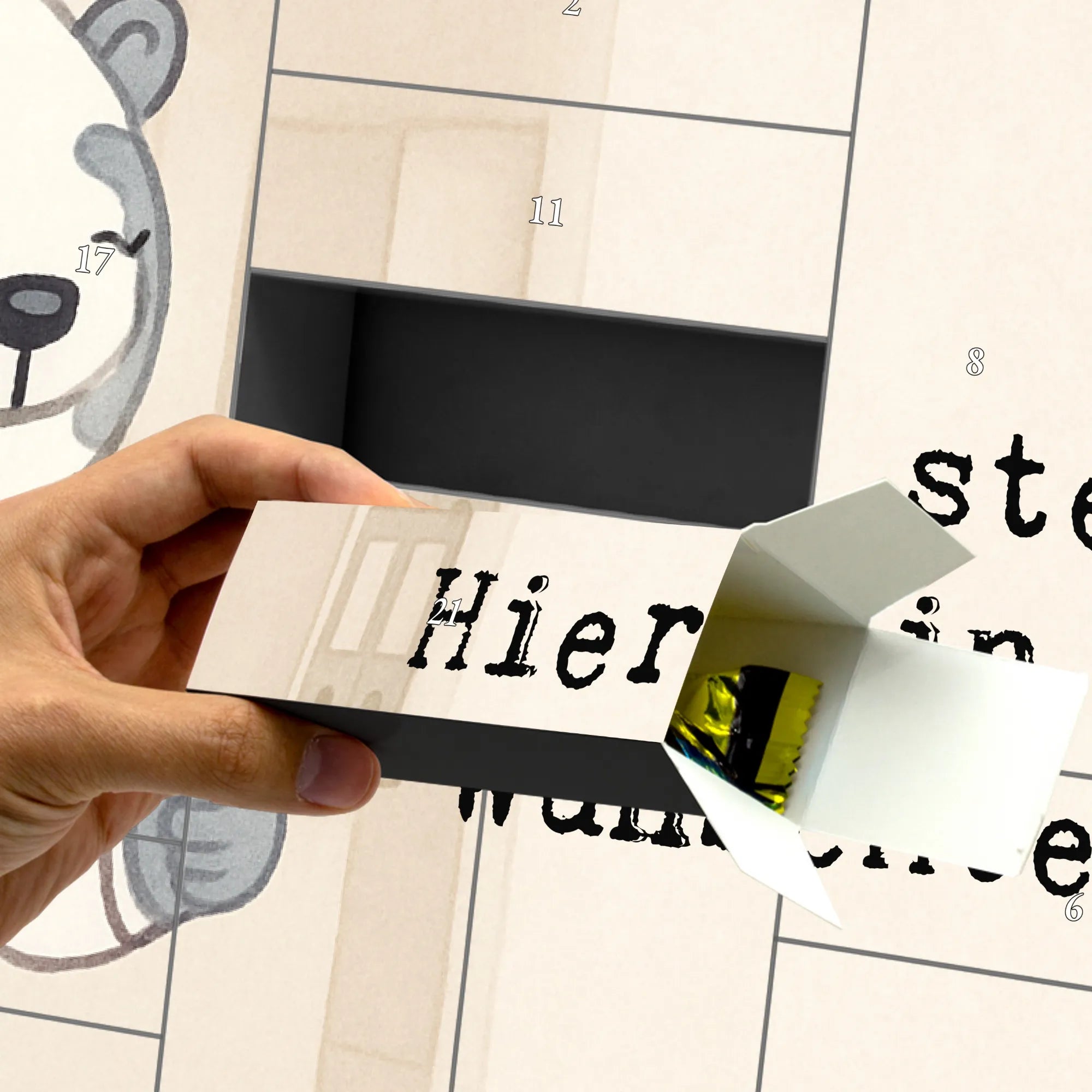 Adventskalender mit Namen – personalisiert und wunderbar gestaltet von Mr. & Mrs. Panda. Dieser Kalender ist ideal, wenn du jemandem eine ganz persönliche Freude machen willst: Wir bedrucken ihn mit deinem Wunschnamen oder Wunschtext und verzieren die Vorderseite mit einer liebenswerten Illustration von Mrs. Panda. Der robuste Adventskalender Karton sorgt für Stabilität, die seidenmatte Oberfläche und die brillante Druckqualität für ein edles Erscheinungsbild. Er enthält 24 Schachteln zum Selbstbefüllen, perfekt für kleine Geschenke, Notizen oder Süßes. Die integrierte Aufstellvorrichtung macht das Dekorieren ganz einfach. Bitte beachte: wird ohne Füllung geliefert. Maße: Breite: 619 mm, Höhe: 405 mm, Tiefe: 50 mm. Ein persönliches Geschenk mit viel Herz – genau im Mr. & Mrs. Panda Stil.