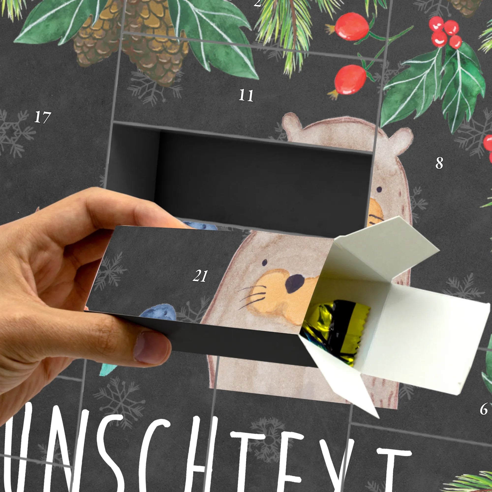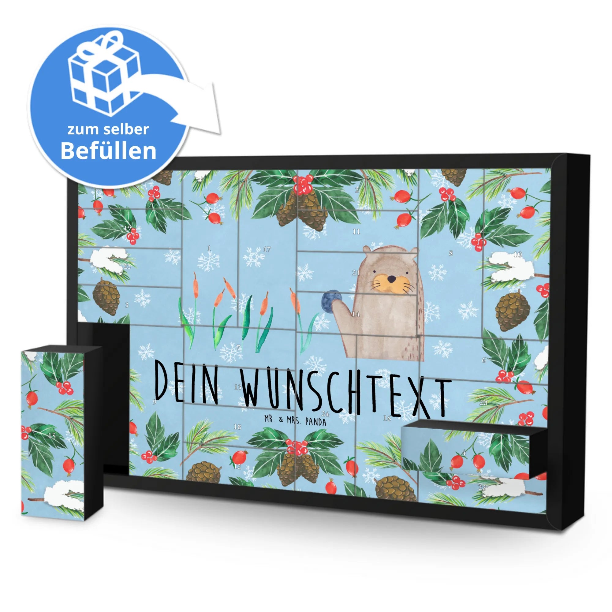 Der Kalender ist zum Selbstbefüllen konzipiert: 24 kleine Schachteln warten auf Deine Überraschungen – von Süßigkeiten über kleine Gutscheine bis zu persönlichen Botschaften. Du kannst ihn mit einem Wunschnamen personalisieren, sodass er zu einem einzigartigen Geschenk wird. Perfekt für Familien, Paare, beste Freundinnen und alle Otter-Fans.