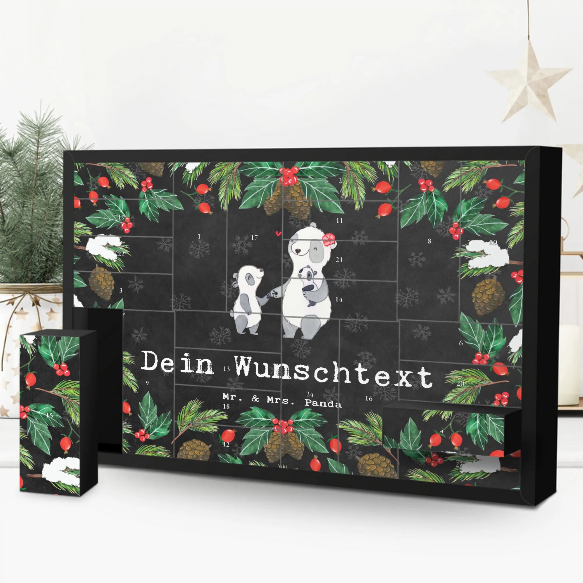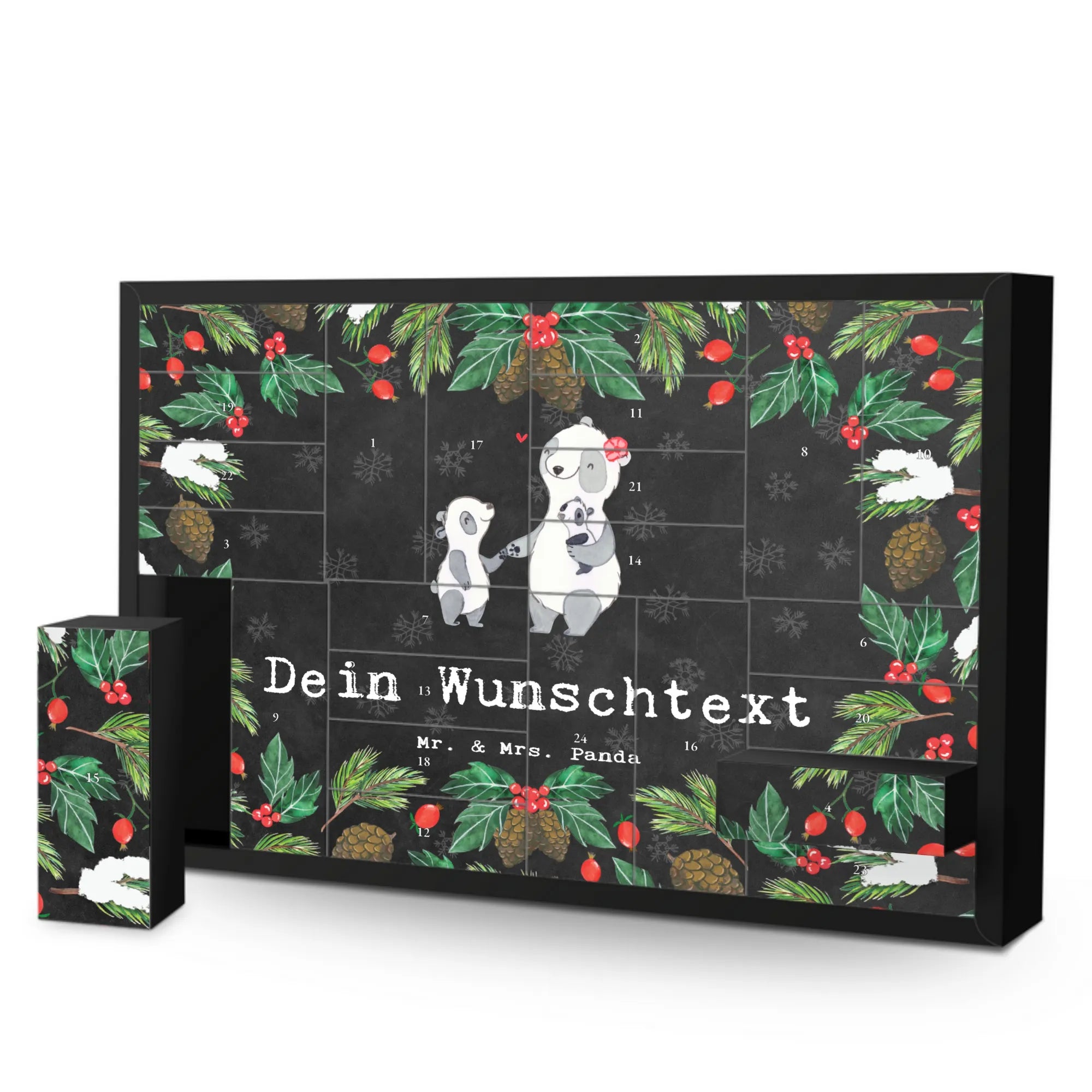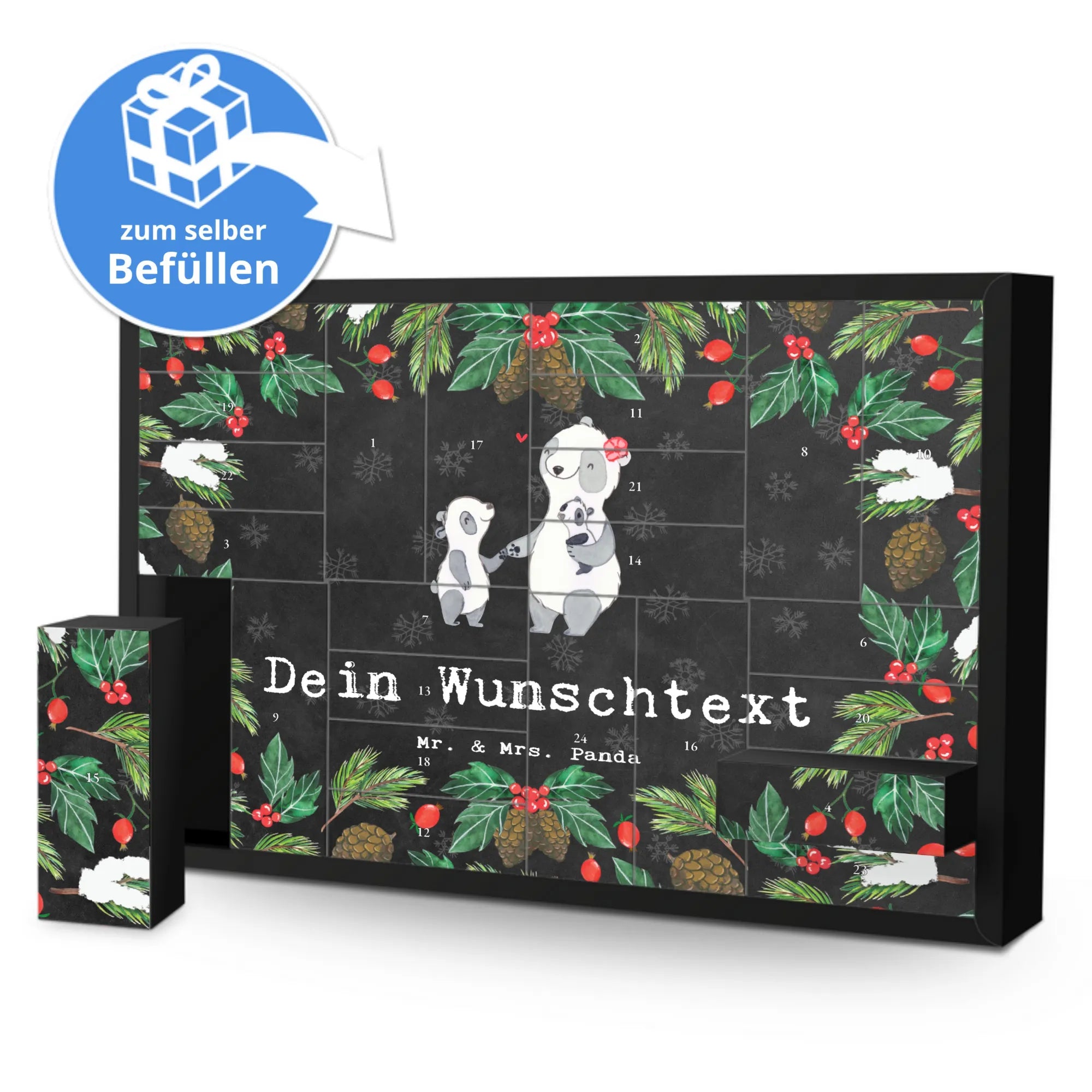 Personalisierter Befüllbarer Adventskalender von Mr. & Mrs. Panda – dein perfekter Begleiter durch die Vorweihnachtszeit! Dieser liebevoll gestaltete Adventskalender ist bedruckt mit wunderschönen Sprüchen und Motiven von Mr. & Mrs. Panda und lässt sich ganz nach deinem Geschmack personalisieren: Trage deinen Wunschnamen oder Wunschtext ein, und wir drucken ihn auf die Vorderseite. Auf der Frontseite findest du eine zauberhafte Zeichnung von Mrs. Panda, die dem Kalender einen warmen, persönlichen Touch verleiht. Der Kalender verfügt über 24 praktische Schachteln zum Selbstbefüllen, ideal für kleine Überraschungen, Süßigkeiten oder liebe Botschaften. Material: stabiler Adventskalender Karton mit brillanter Druckqualität und seidenmatter Oberfläche für eine hochwertige Optik. Besonderheit: inklusive Aufstellvorrichtung, sodass du den Kalender überall dekorativ platzieren kannst. Besonderer Hinweis: wird ohne Füllung geliefert – so kannst du ihn individuell bestücken. Maße: Breite: 619 mm, Höhe: 405 mm, Tiefe: 50 mm. Ein tolles Geschenk für Familie, Freunde oder als persönliche Deko für dein Zuhause. Bestelle jetzt deinen personalisierten Adventskalender und erfreue deine Liebsten jeden Tag im Dezember mit kleinen Überraschungen!