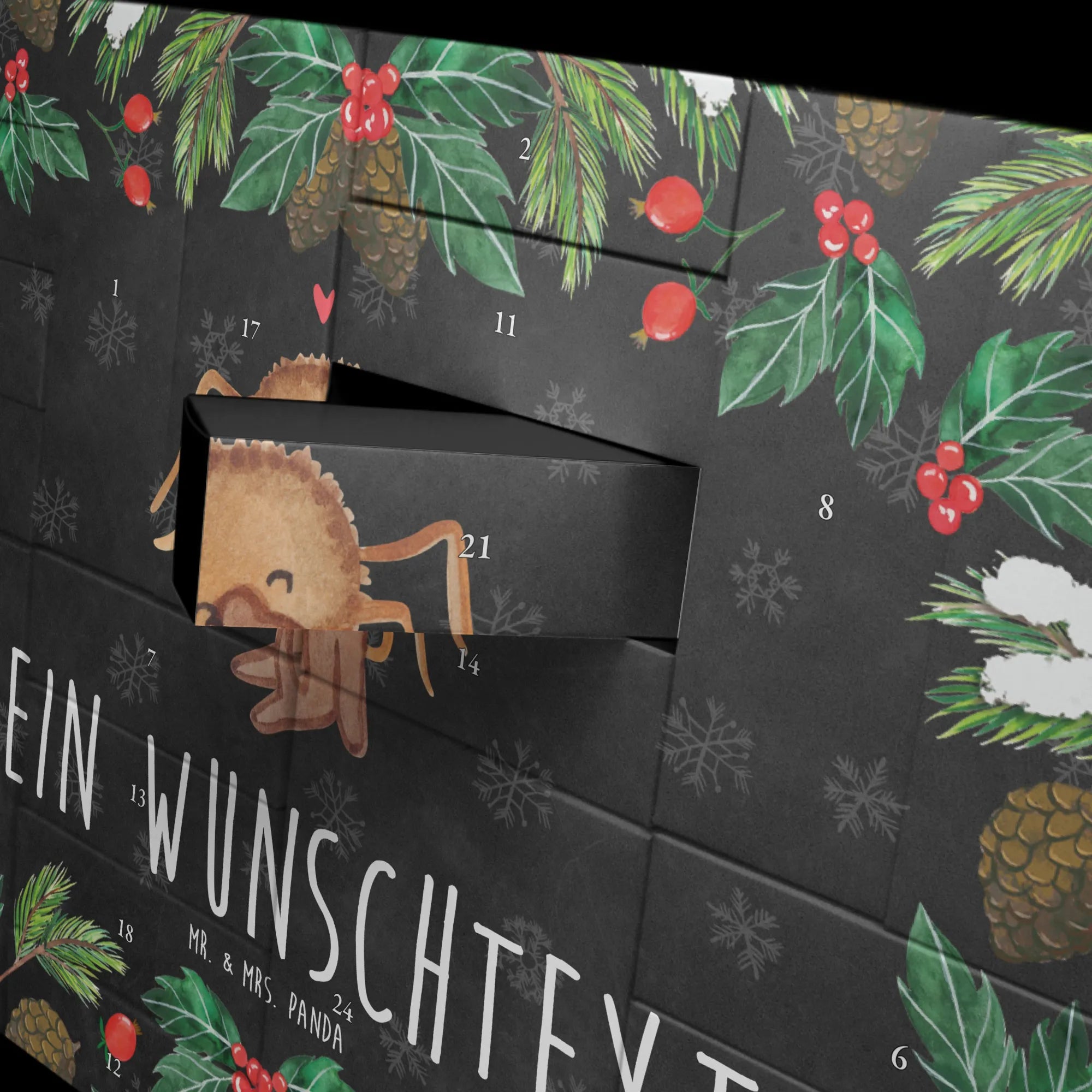 Perfekt für Paare, die ihre Zuneigung in der Vorweihnachtszeit zelebrieren möchten oder für Freunde, um eine schöne Zeit des Miteinanders zu erleben. Jedes Detail des Designs wurde mit viel Liebe von Mrs. Panda handgezeichnet, was ihn zu einem einzigartigen Merkmal macht. Die brillante Druckqualität und die seidenmatte Oberfläche verleihen diesem Adventskalender einen edlen Look, sodass er nicht nur gefüllt, sondern auch als dekoratives Element in deinem Zuhause glänzen kann.