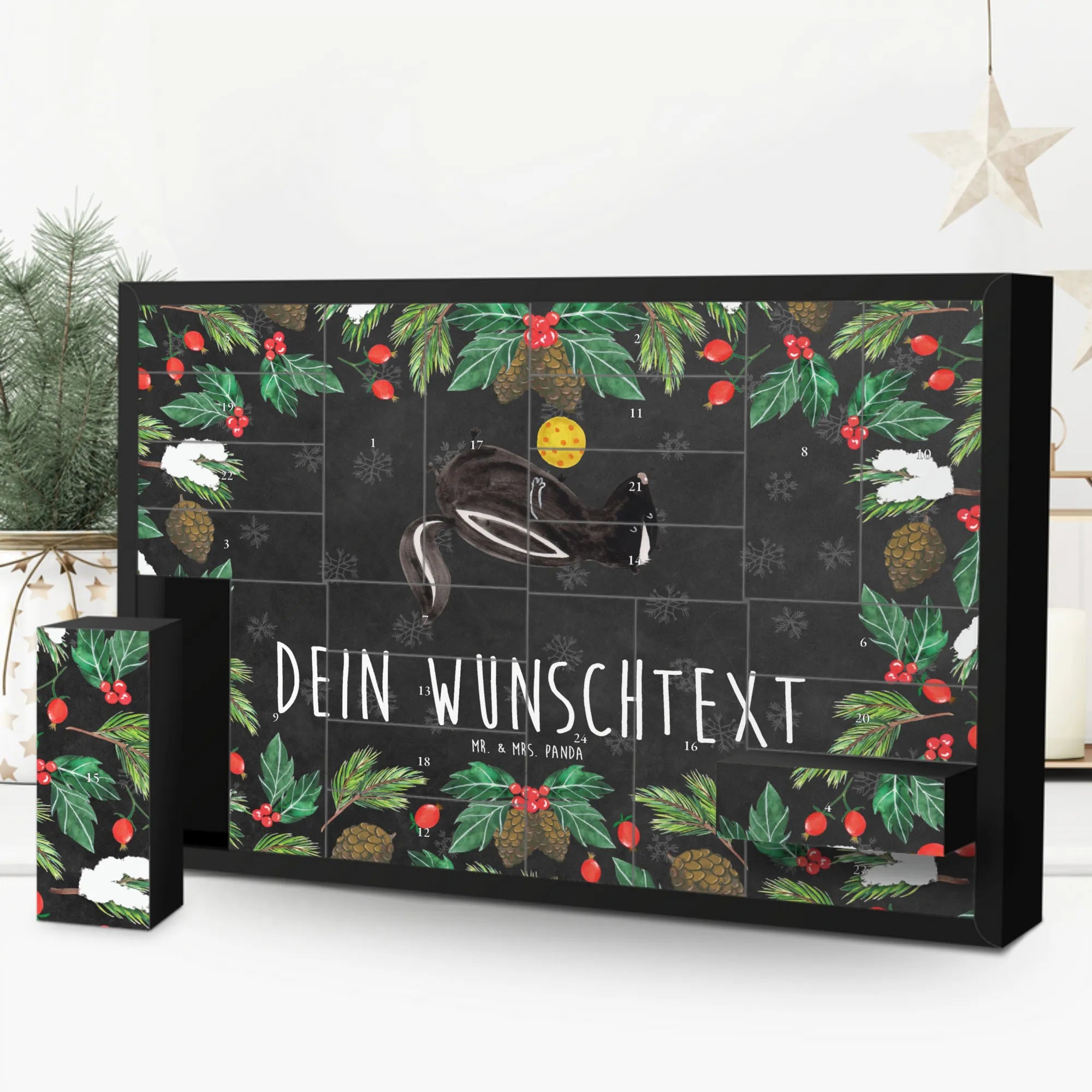 Der personalisierte befüllbare Adventskalender "Stinktier Ball" von Mr. & Mrs. Panda ist das ideale Geschenk für alle Tierliebhaber und die, die die Vorweihnachtszeit mit einem Hauch von Humor und verspielten Motiven verschönern möchten.
