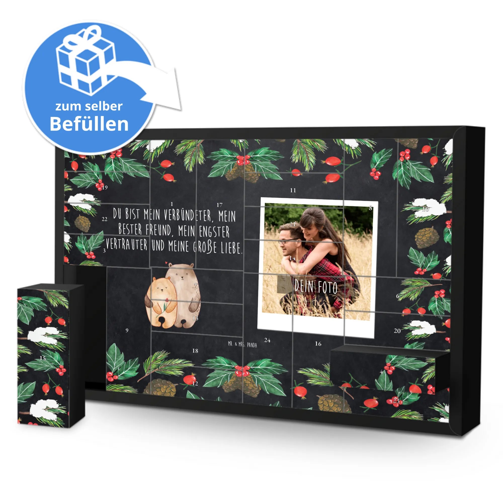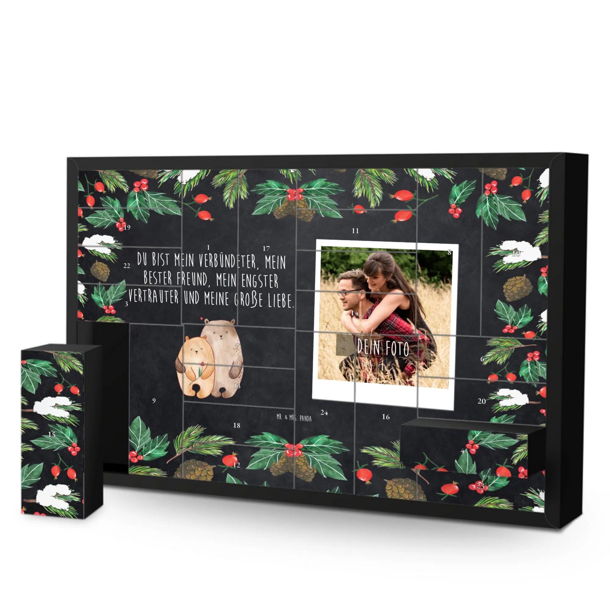 Der Personalisierte Befüllbare Foto Adventskalender mit dem Motif Bären Liebe von Mr. & Mrs. Panda ist das perfekte Geschenk für all diejenigen, die Liebe und Zuneigung in einer besonderen Art und Weise ausdrücken möchten. Dieser einzigartige Weihnachtskalender, der Platz für 24 liebevoll gefüllte Überraschungen bietet, lässt Herzen höher schlagen. Das bezaubernde Design mit den süßen Bären, die ein Herz formen, spricht nicht nur Verliebte, sondern auch beste Freunde, Partner, Ehemänner und Ehefrauen an. Mit dem dazugehörigen Slogan "Du bist mein Verbündeter, mein bester Freund, mein engster Vertrauter und meine große Liebe" wird jede gefüllte Schachtel zu einem unvergesslichen Liebesbeweis.