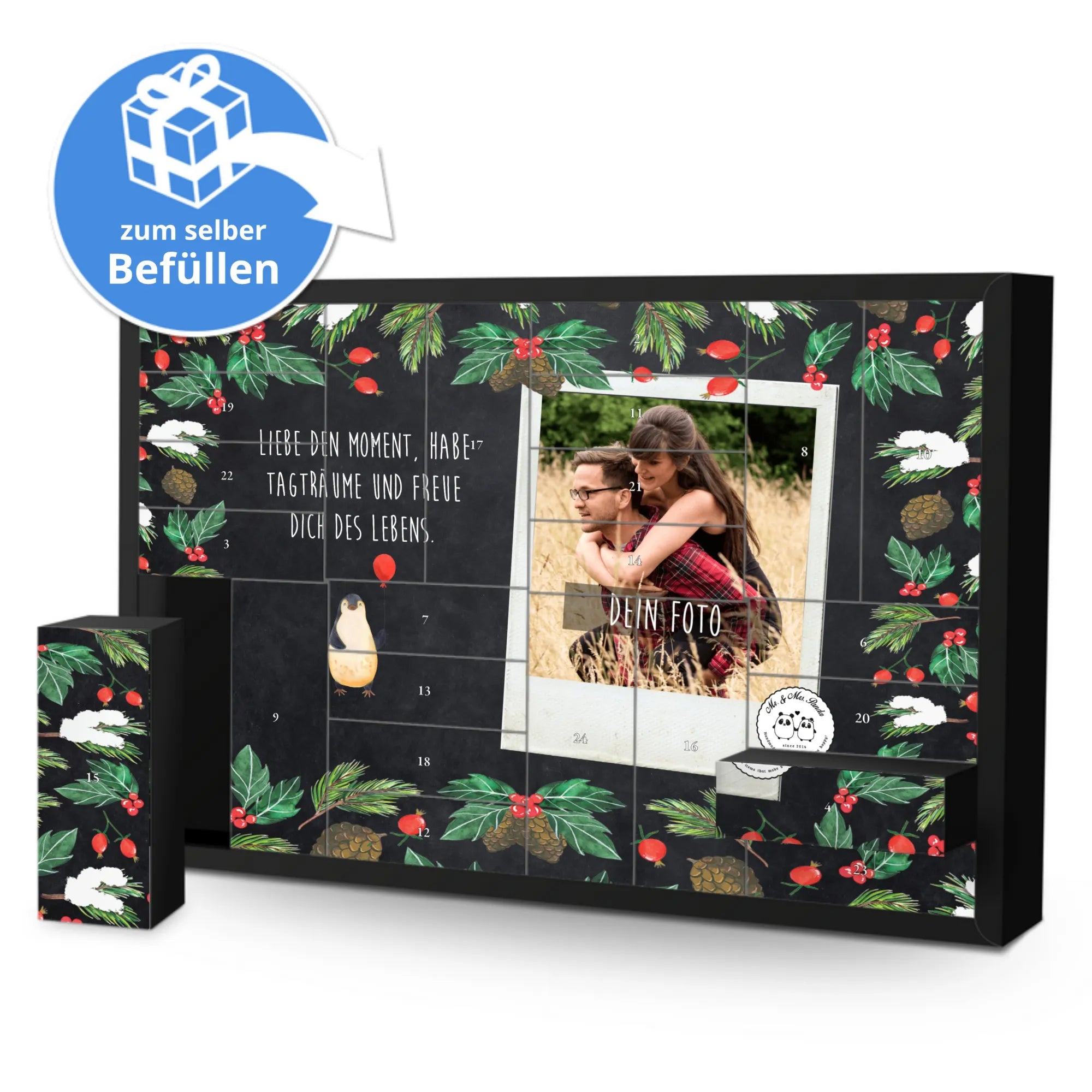 Bist du auf der Suche nach dem perfekten Adventskalender, der Freude und persönliche Erinnerungen in die Vorweihnachtszeit bringt? Unser personalisierbarer, befüllbarer Foto Adventskalender im Pinguin-Luftballon Design von Mr. & Mrs. Panda ist genau das, was du suchst!