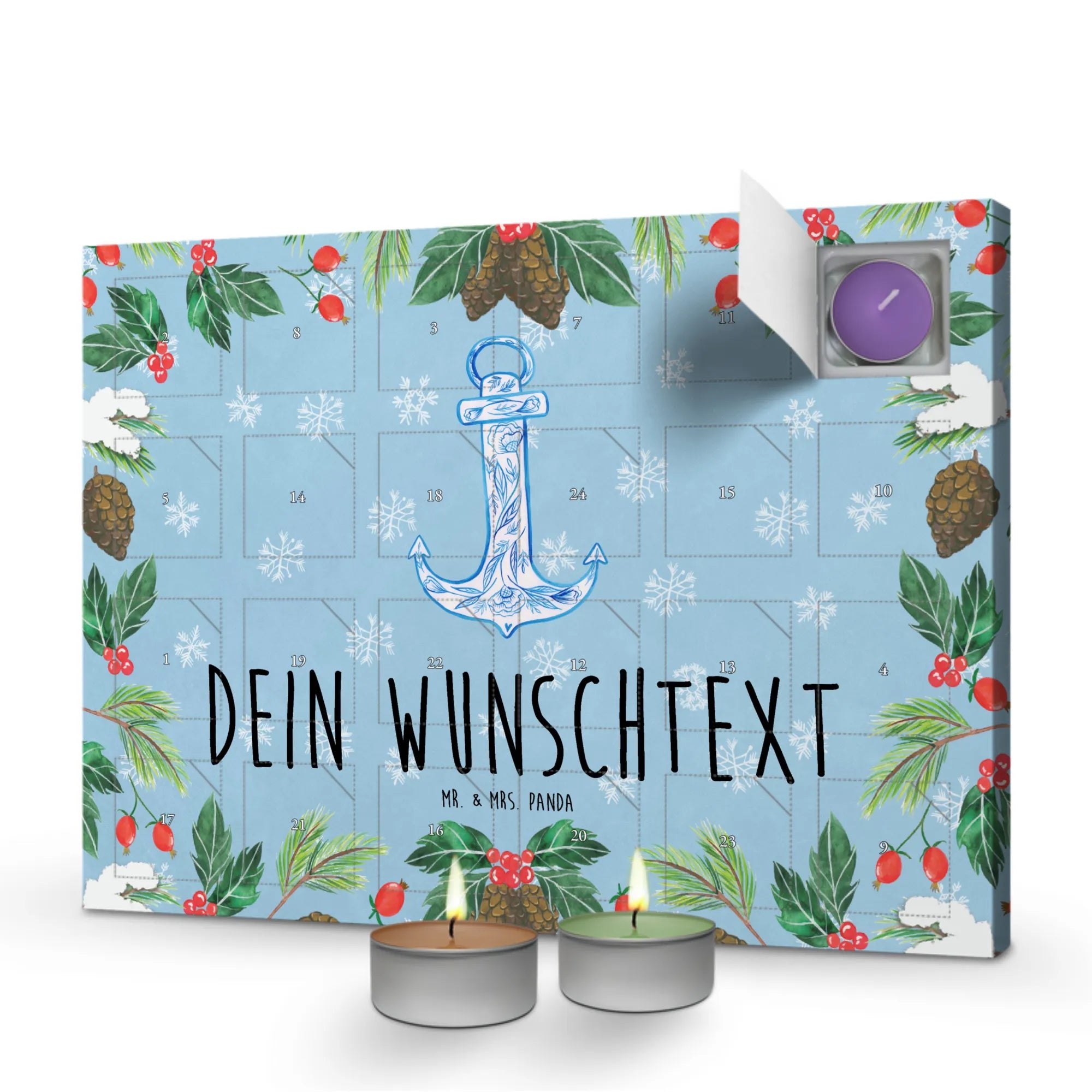 Entdecke den personalisierten Duftkerzen Adventskalender "Anker Blau" von Mr. & Mrs. Panda! 🎄 Dieser bezaubernde Adventskalender ist mehr als nur ein dekoratives Stück – er ist eine Oase der guten Laune in der Vorweihnachtszeit! Ob für dich selbst oder als gefühlvolles Geschenk für einen besonderen Menschen: Mit jedem Türchen öffnest du nicht nur eine kleine Überraschung, sondern auch einen wunderbaren Duft, der dein Zuhause in eine gemütliche Atmosphäre taucht.