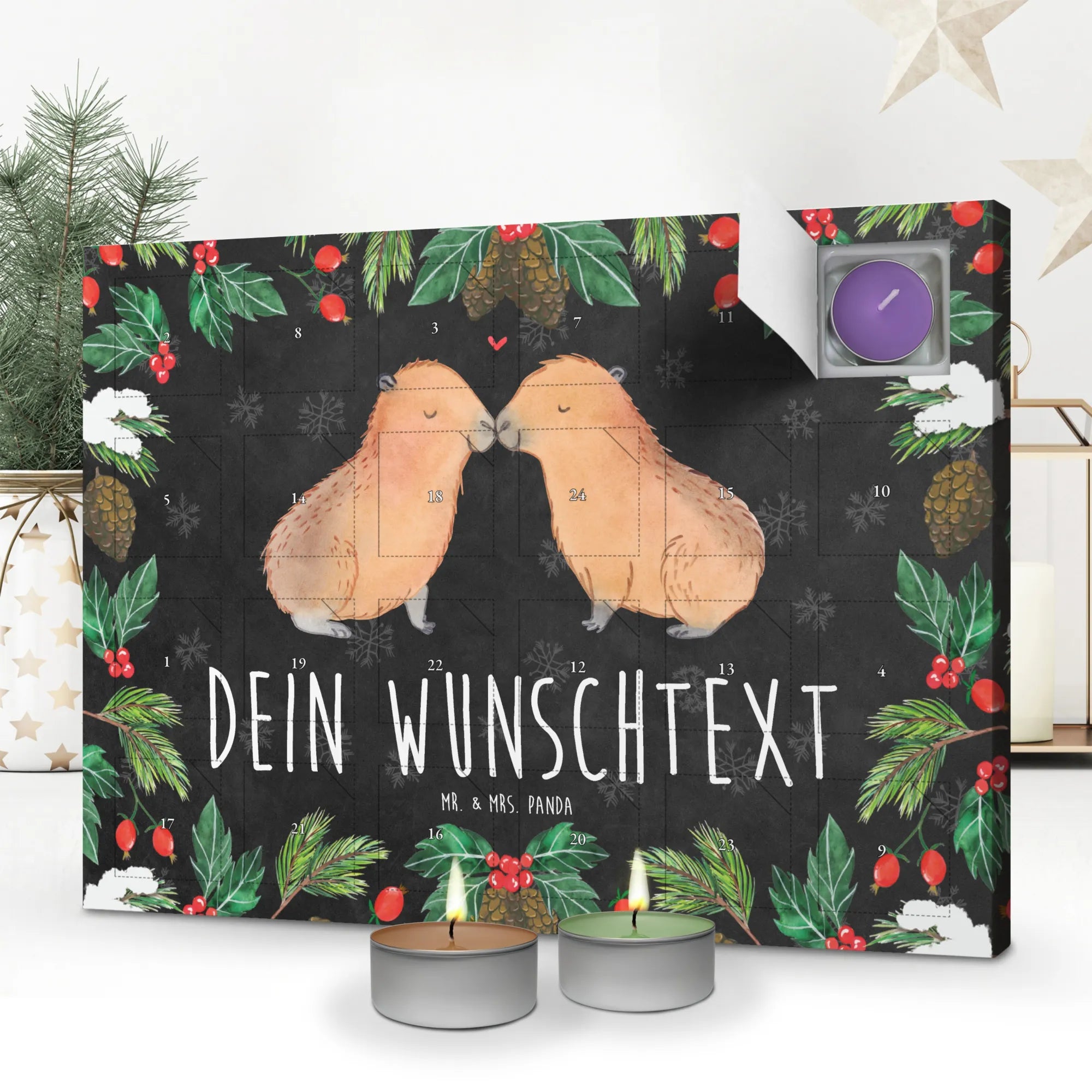 Der personalisierte Duftkerzen Adventskalender von Mr. & Mrs. Panda ist das perfekte Geschenk für all jene, die Romantik und tierische Liebe schätzen. Mit dem bezaubernden Motiv der kuschelnden Capybaras, die sich in zärtlicher Umarmung befinden, bringt dieser Adventskalender die Herzen zum Schmelzen. Jedes Türchen des Kalenders versteckt eine liebevoll gestaltete Duftkerze, die nicht nur für wohlige Entspannung sorgt, sondern auch die Vorfreude auf die bevorstehenden Feiertage steigert.