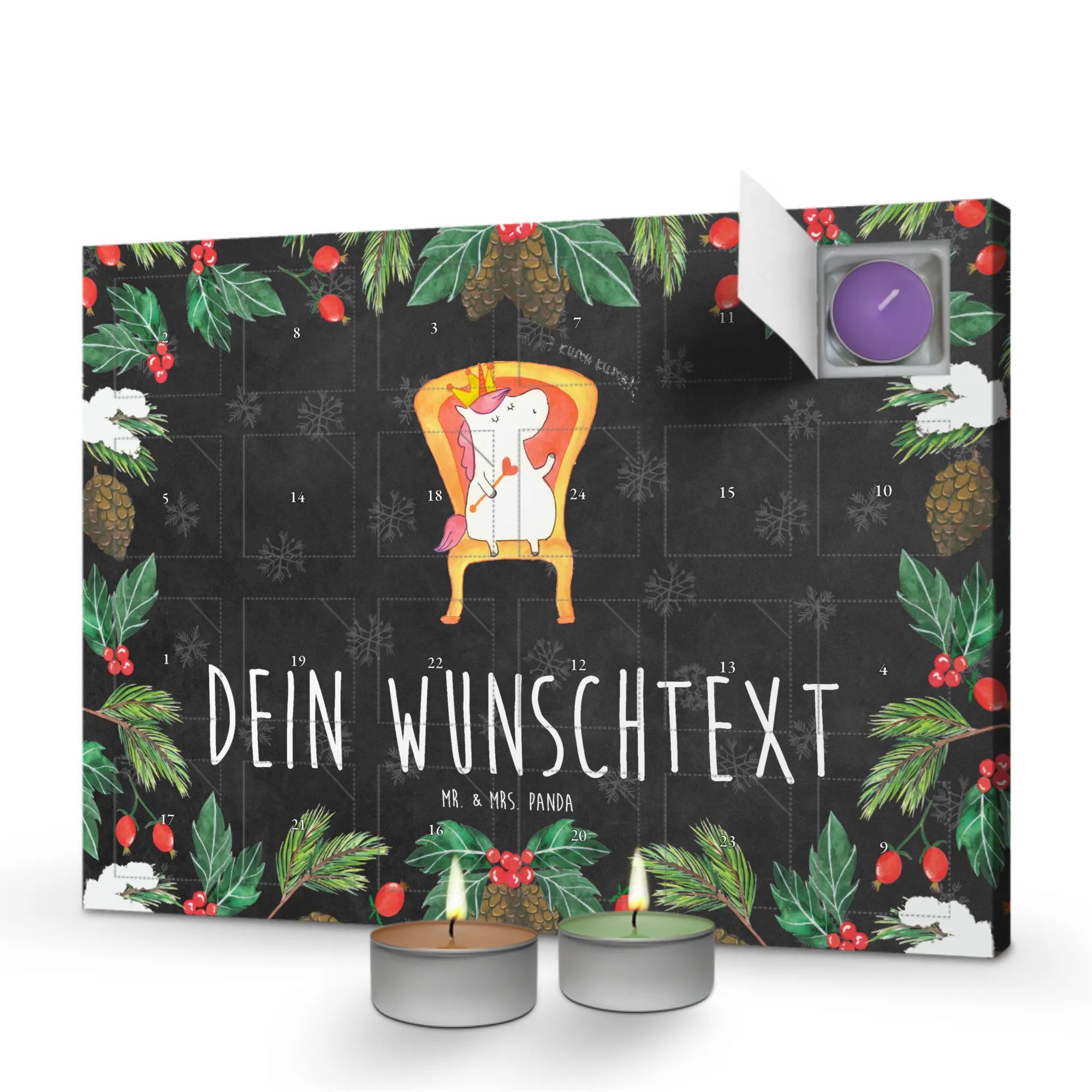 Der personalisierte Duftkerzen Adventskalender Einhorn König von Mr. & Mrs. Panda ist das perfekte Geschenk für alle Einhorn-Liebhaber und für die, die sich gerne wie ein König fühlen möchten! Mit seinem süßen Einhorn auf dem Thron und der liebevollen Zeichnung von Mrs. Panda wird dieser Adventskalender garantiert zum Highlight in jedem Zuhause.