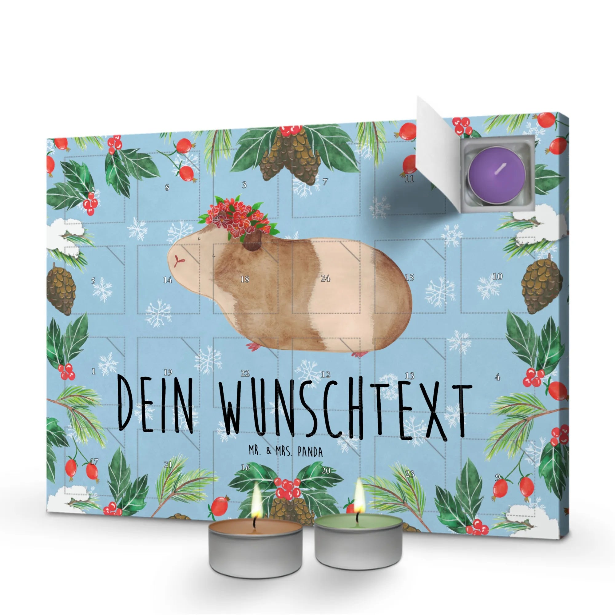 Der personalisierte Duftkerzen Adventskalender von Mr. & Mrs. Panda mit dem zauberhaften Motiv 'Meerschweinchen weise' ist das perfekte Geschenk für alle, die in der besinnlichen Vorweihnachtszeit Freude und gute Laune verbreiten möchten!