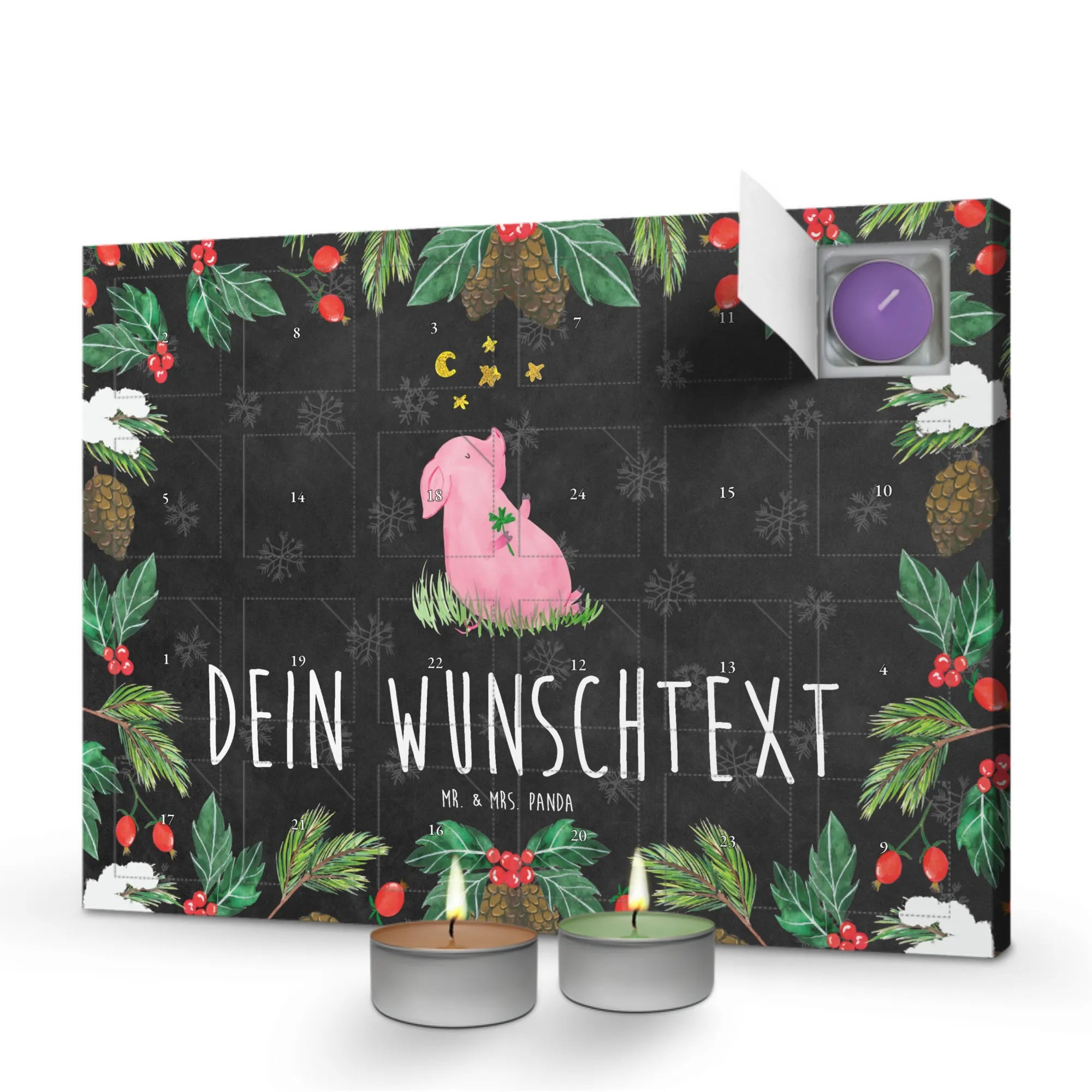 Der personalisierte Duftkerzen Adventskalender mit dem süßen Glücksschwein Motiv von Mr. & Mrs. Panda ist das perfekte Geschenk für alle, die sich eine Extraportion Glück und gute Laune ins Zuhause holen möchten. Dieser einzigartige Adventskalender bringt dir nicht nur 24 wundervolle Duftkerzen, sondern auch eine liebevolle Botschaft für jeden Tag der Adventszeit. Das Glücksschwein auf dem Kalender symbolisiert Lebensfreude und Motivation und ist der ideale Begleiter für deine Träume und Ziele. Ob für Freunde, Familie oder dich selbst, dieser Adventskalender wird mit Sicherheit für strahlende Augen und ein glückliches Herz sorgen.