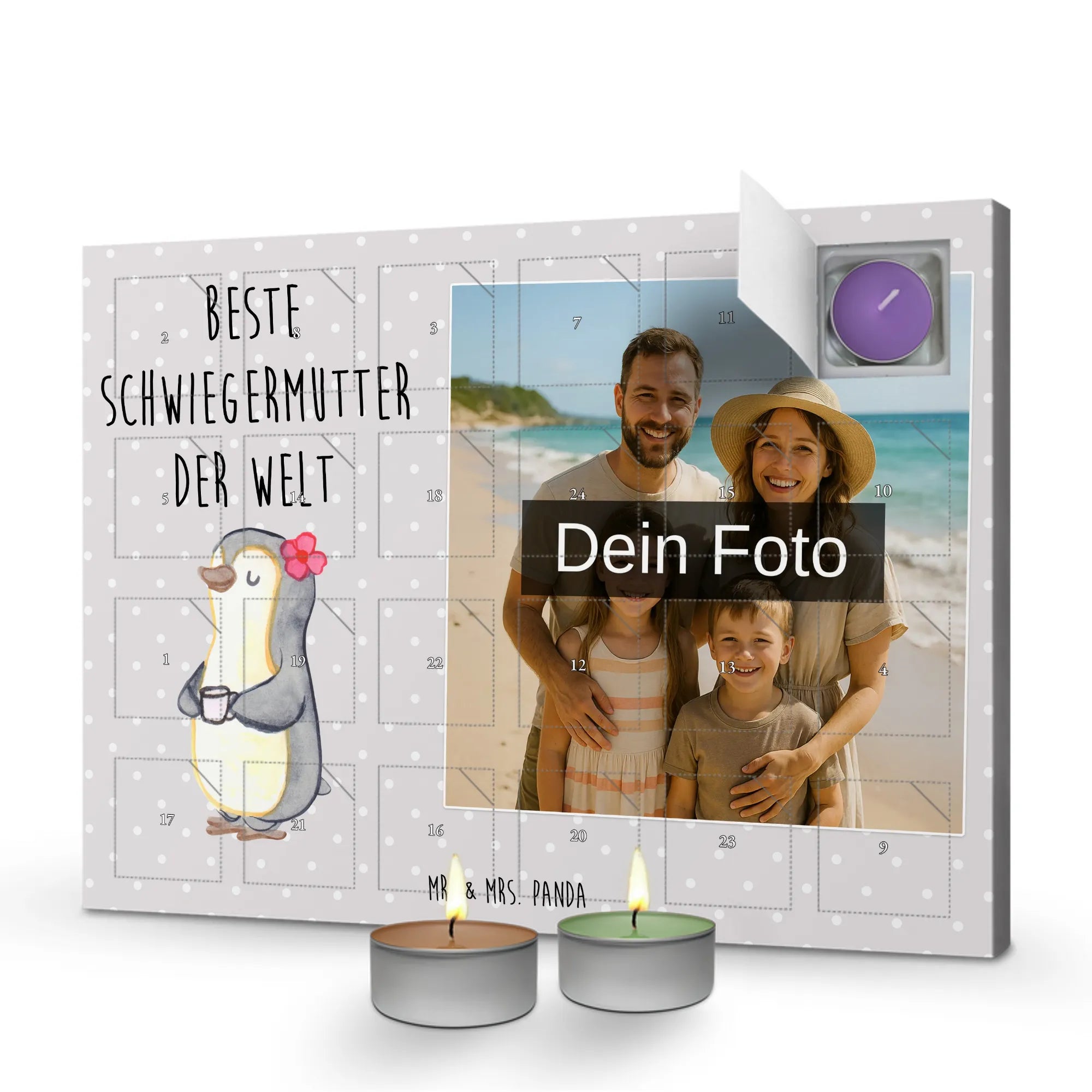 Der personalisierte Duftkerzen Foto Adventskalender mit dem süßen Pinguin ''Beste Schwiegermutter der Welt'' von Mr. & Mrs. Panda ist das perfekte Geschenk für deine Schwiegermutter!