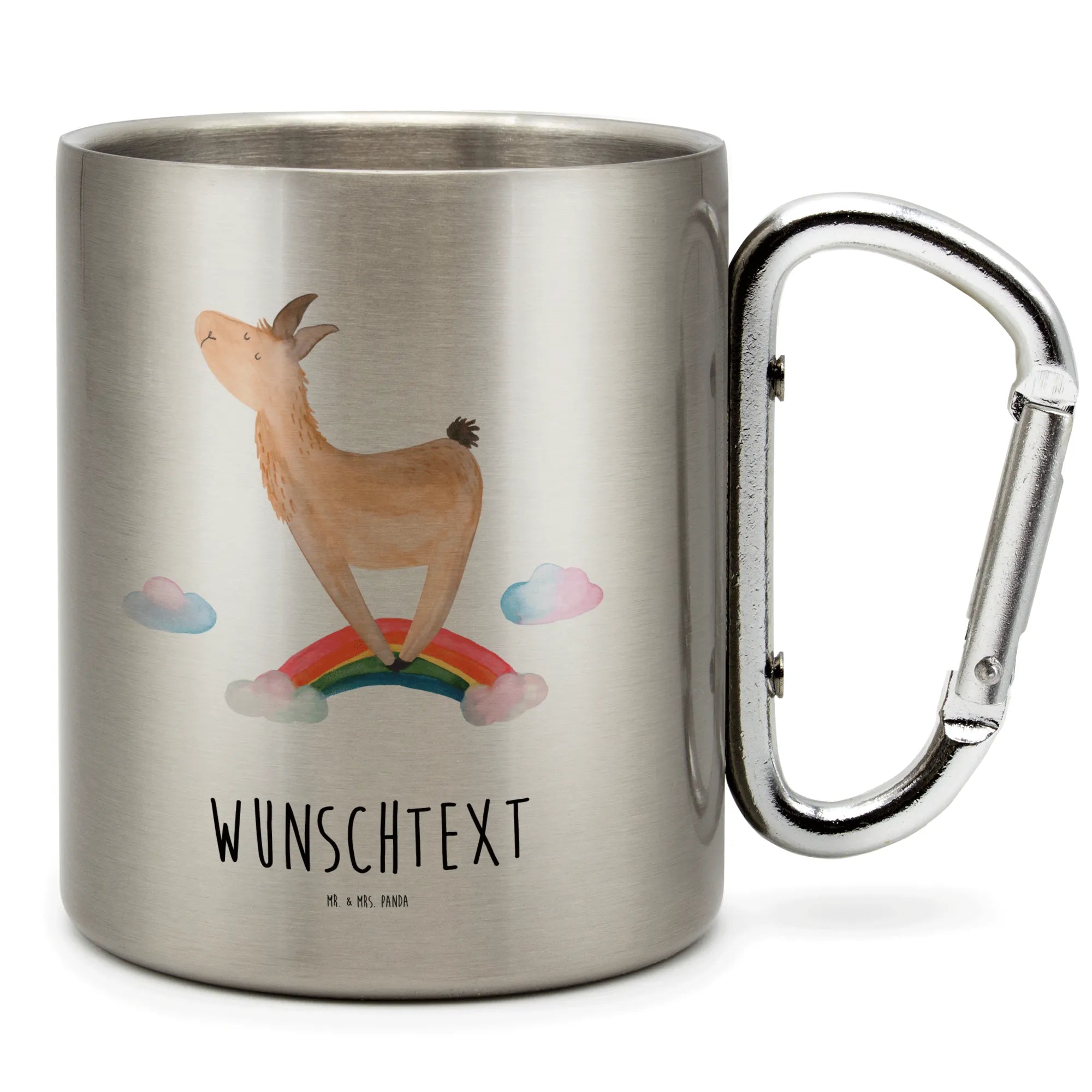 Ein wunderschöner und robuster personalisierter Edelstahlbecher von Mr. & Mrs. Panda, perfekt für echte Lama-Fans! Dieses besondere Stück aus der Lama-Kollektion wird alle Augen auf sich ziehen, vor allem mit dem bezaubernden Motiv eines süßen Lamas, das fröhlich über einen Regenbogen hüpft.