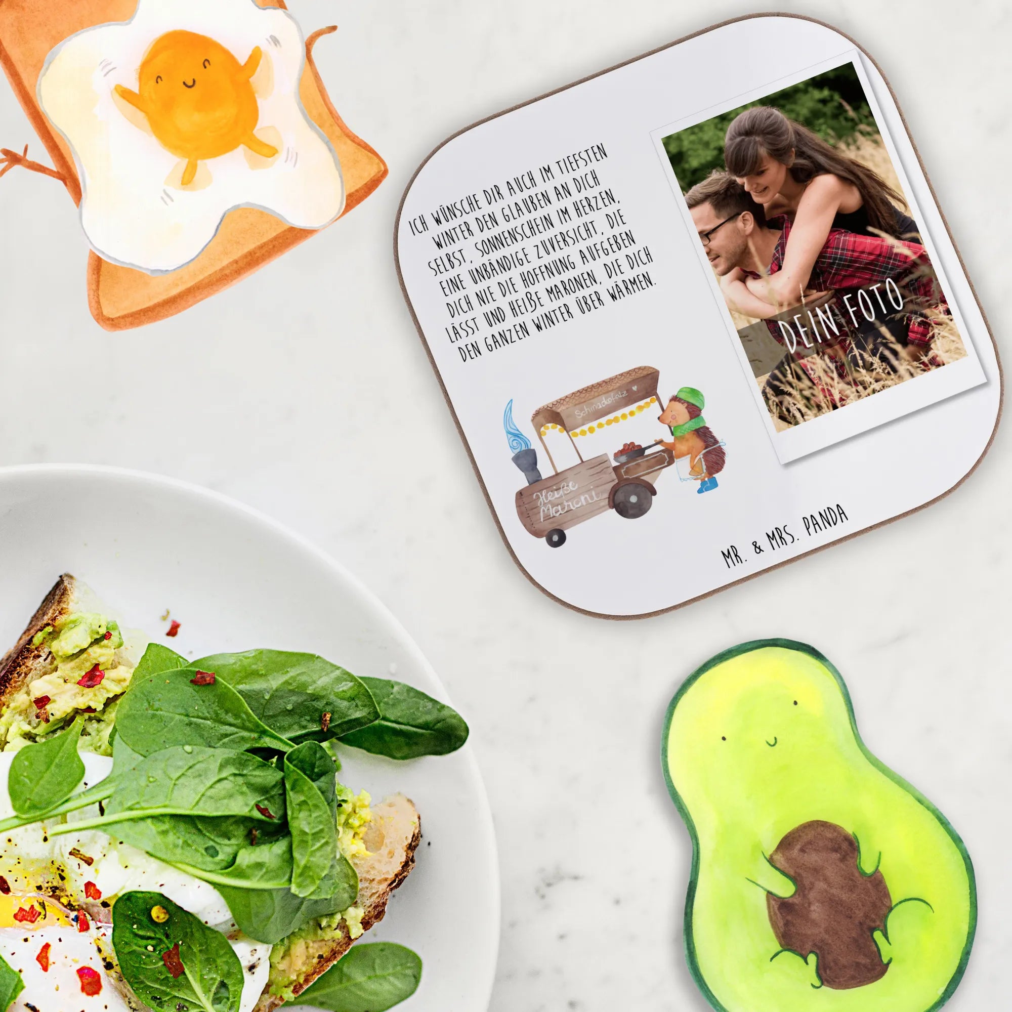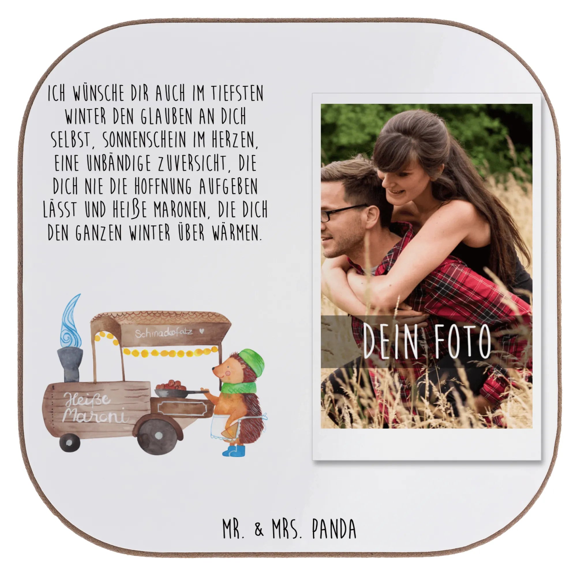 Der personalisierte Foto Untersetzer mit dem süßen Igel-Motiv von Mr. & Mrs. Panda ist das perfekte Geschenk für alle, die den Winter lieben! Stell dir vor, wie dieser kleine Igel in seinen blauen Stiefeln und dem grünen Schal vor einem Stand mit heißen Maronen steht. Er lädt dich ein, die Gemütlichkeit der Winterzeit zu genießen.