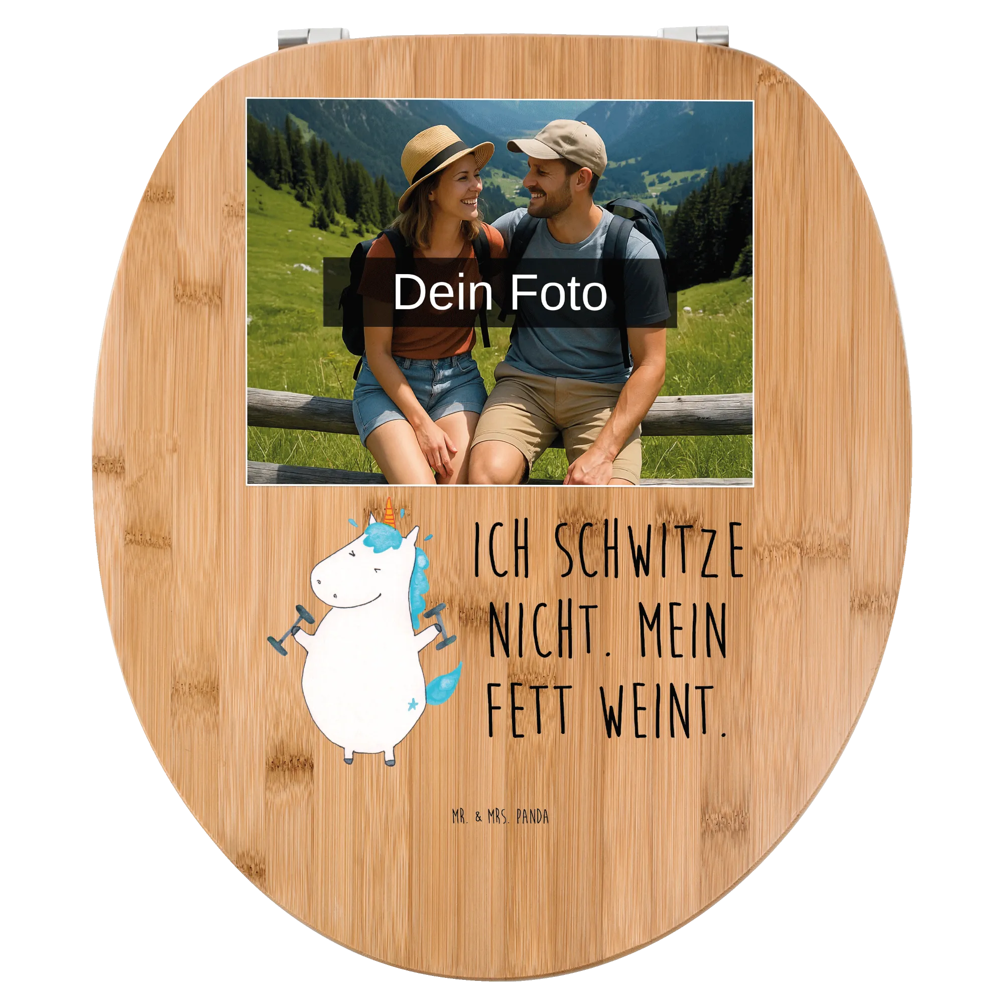 Mach dein Badezimmer zu einem besonderen Ort mit unserem personalisierten Foto WC Sitz Motiv! Der Sitz hat die Maße von 430 mm x 370 mm x 50 mm und ist wahlweise aus hochwertigem Bambus Holz (braun) oder robustem MDF Holz (weiß) gefertigt. Dieser liebevoll gestaltete Toilettensitz wird mit süßen Motiven und zauberhaften Sprüchen von Mr. & Mrs. Panda bedruckt. Lass deiner Kreativität freien Lauf und personalisiere ihn mit deinem eigenen Wunschfoto! Achte darauf, dass das hochgeladene Motiv hochauflösend ist, damit der Druck klar und lebendig wird. Denk daran, den richtigen Bildausschnitt zu wählen, damit keine wichtigen Details verloren gehen. Dieser WC Sitz passt auf alle Euro-WC-Becken und ist mit einem einfachen Montageset ausgestattet. Er bietet nicht nur hohen Sitzkomfort, sondern sorgt dank seiner speziellen Eigenschaften für ein angenehmes Sitzgefühl, selbst an kalten Tagen. Mit einem süßen Motiv bringst du mehr Lebensfreude in dein Badezimmer. Pflege dein neues Schmuckstück ganz einfach mit einem feuchten Tuch und handelsüblicher Seife, ohne aggressive Putzmittel. Der hochqualitative UV-Druck sorgt dafür, dass das Motiv lange strahlend bleibt. Hol dir jetzt diesen besonderen Toilettensitz und mach dein Bad einzigartig!