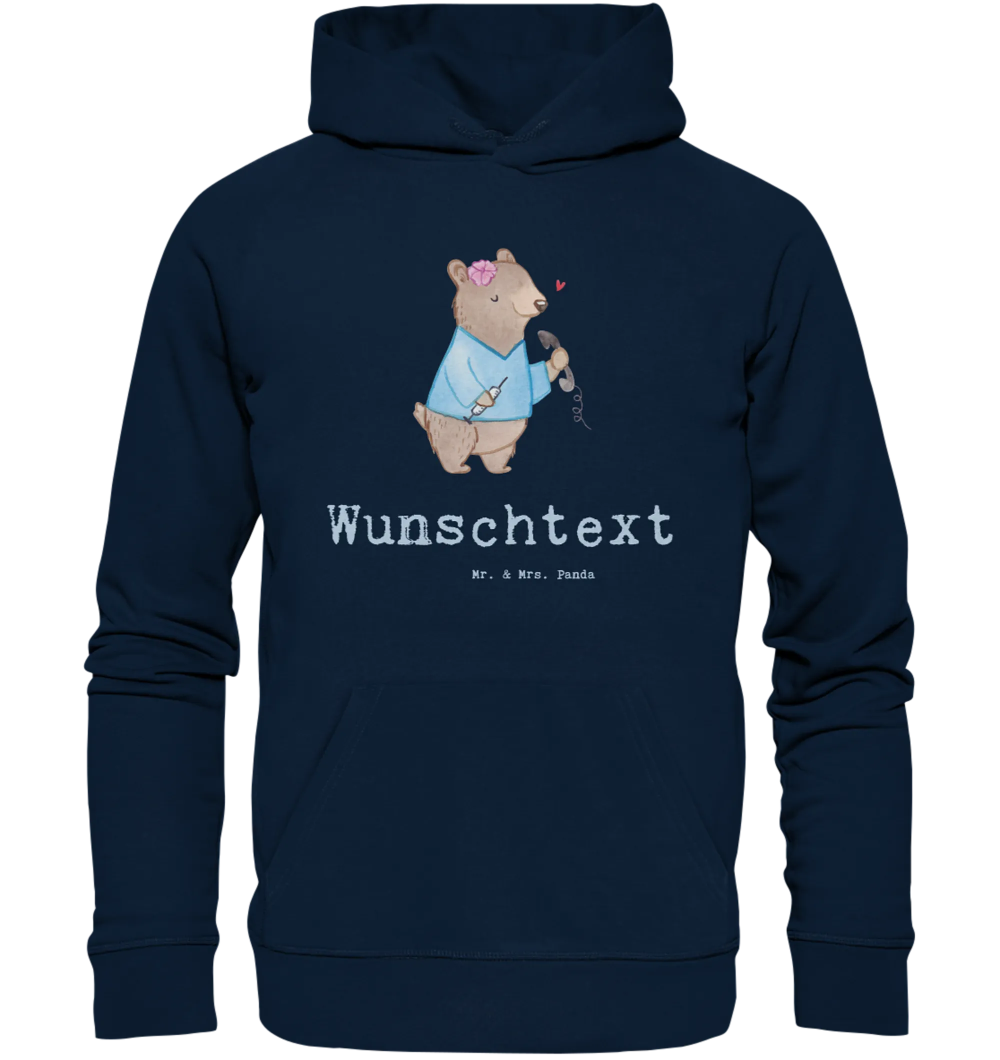 Der Hoodie besticht durch sein besonderes Design: Ein liebevoll gezeichneter Bär in einem blauen Kittel, der mit Telefon und Spritze ausgestattet ist. Und das Beste - du kannst ihn mit deinem Wunschtext oder Namen personalisieren! Dieser Hoodie ist nicht nur stylisch, sondern auch einzigartig und persönlich.