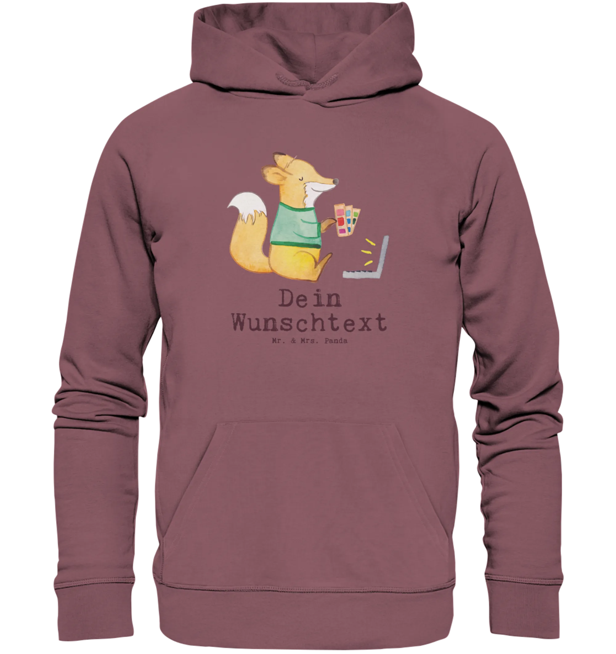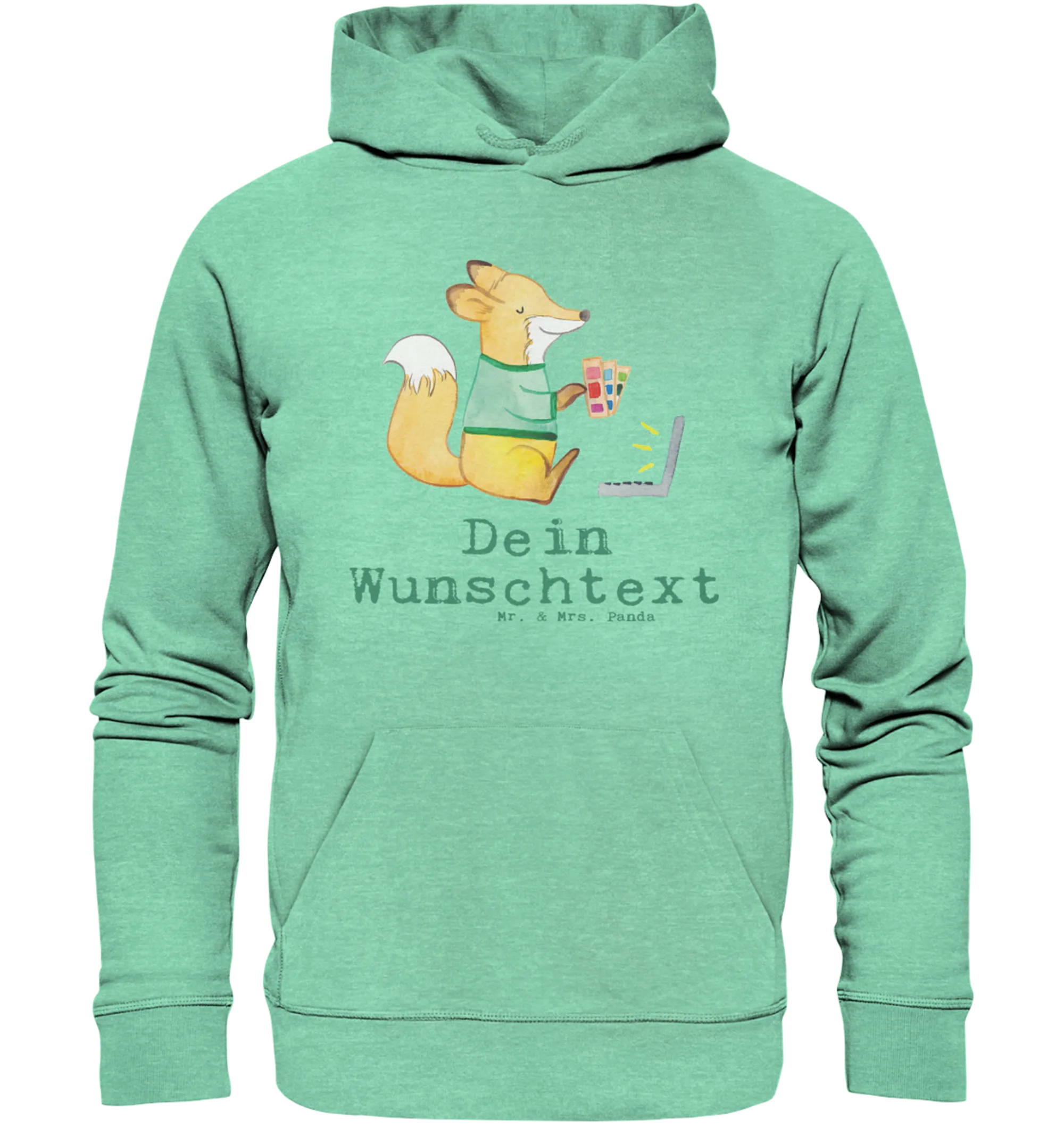 Mit einem süßen Fuchs-Motiv, der an einem Laptop sitzt und einen Farbfächer in der Hand hält, bringt dieser Hoodie alle kreativen Herzen zum Schmelzen. Du kannst den Hoodie ganz nach deinen Wünschen personalisieren, indem du deinen eigenen Namen oder einen individuellen Wunschtext hinzufügst. Ideal für Mediengestalter, Grafikdesigner und kreative Köpfe, die ihrem Beruf mit Stolz begegnen!