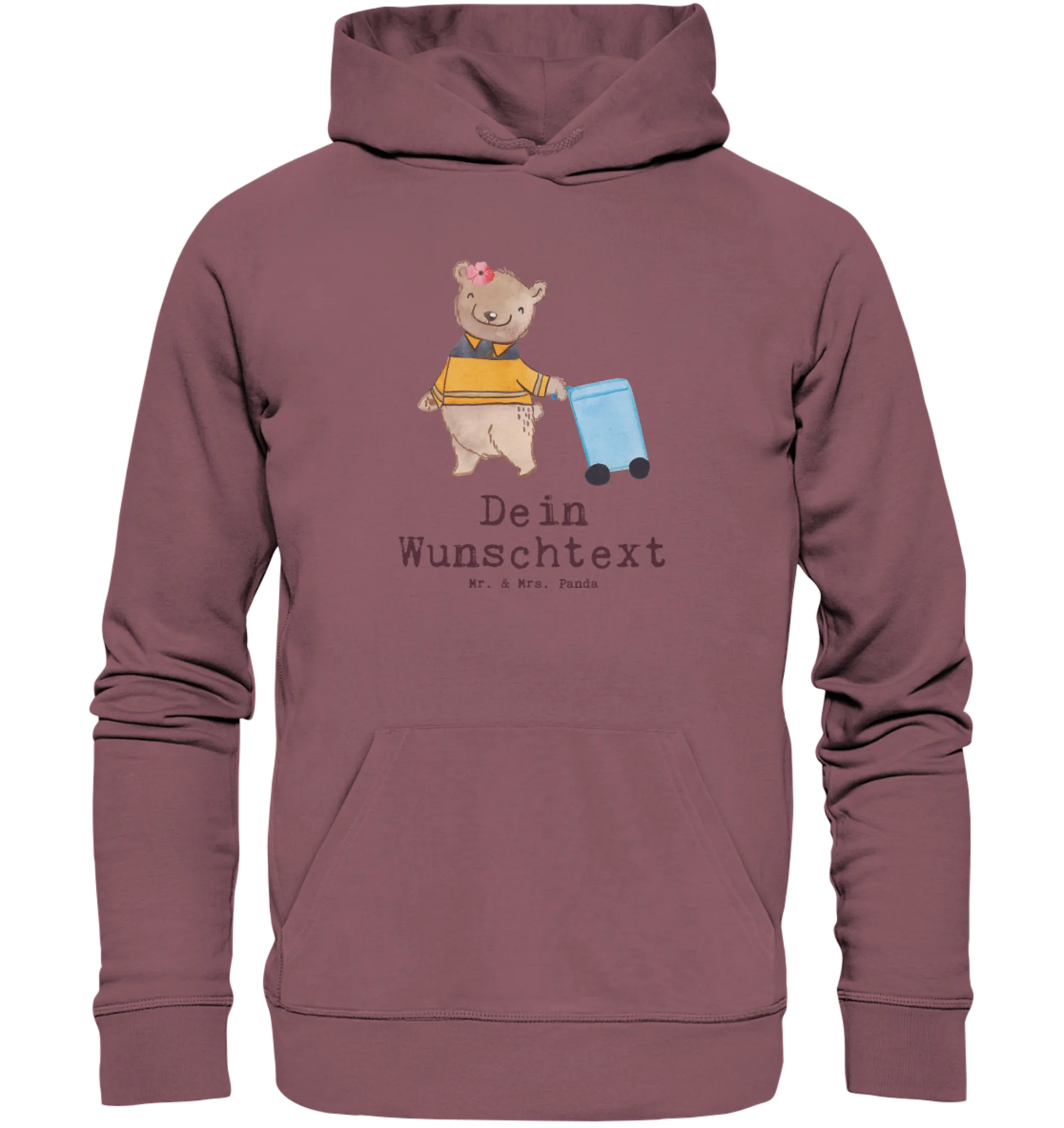 Unser Bio Hoodie Mit Namen ist eine Kombination aus nachhaltigem Design und persönlicher Note. Auf der Vorderseite prangt das handgezeichnete Aquarell-Motiv von Mrs. Panda: ein fröhlicher, weiblicher Bär, der eine Papiertonne schiebt, begleitet vom frechen Slogan „Du bist nur ein halber Mensch, wenn du keine Müllwerkerin bist." Du kannst den Hoodie mit Deinem Wunschname personalisieren – ideal als individuelles Dankeschön oder Abschiedsgeschenk.