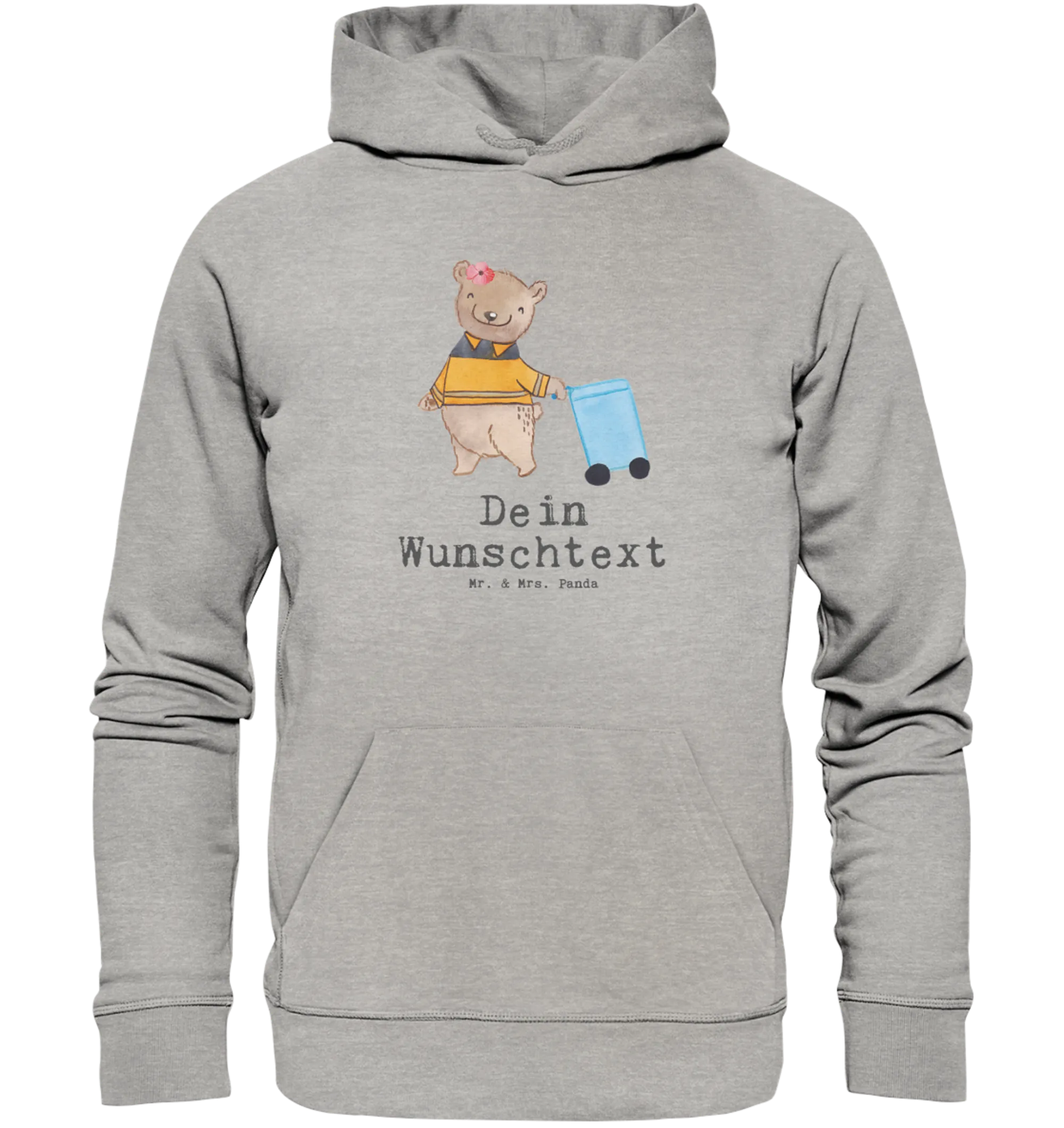 Unser personalisierter Organic Hoodie „Müllwerkerin mit Herz" aus der Berufe-Kollektion von Mr. & Mrs. Panda vereint liebevolle Illustration, frechen Spruch und ökologische Verantwortung. Die niedliche Bärendame, die eine Papiertonne hinter sich herzieht, trifft genau den richtigen Ton für alle Müllfrauen und Müllwerkerinnen. Der Slogan „Du bist nur ein halber Mensch, wenn du keine Müllwerkerin bist." macht das Motiv zu einem stolzen Statement.