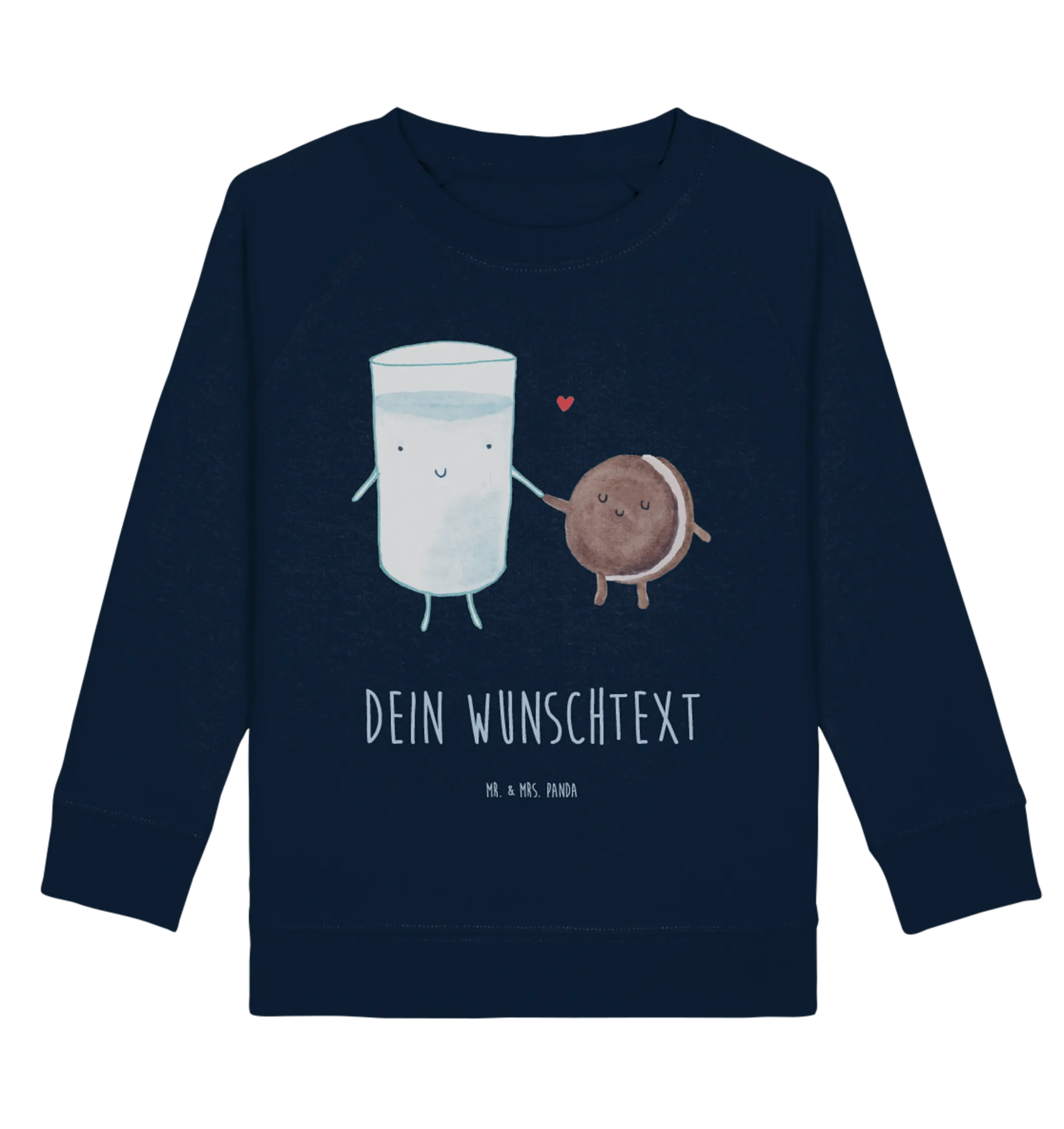 Entdecke den personalisierten Kinder Pullover mit dem süßen Motiv "Milch & Keks" von Mr. & Mrs. Panda! Ein Glas Milch und ein Keks, die liebevoll Händchen halten, zaubern jedem Kind ein Lächeln ins Gesicht.