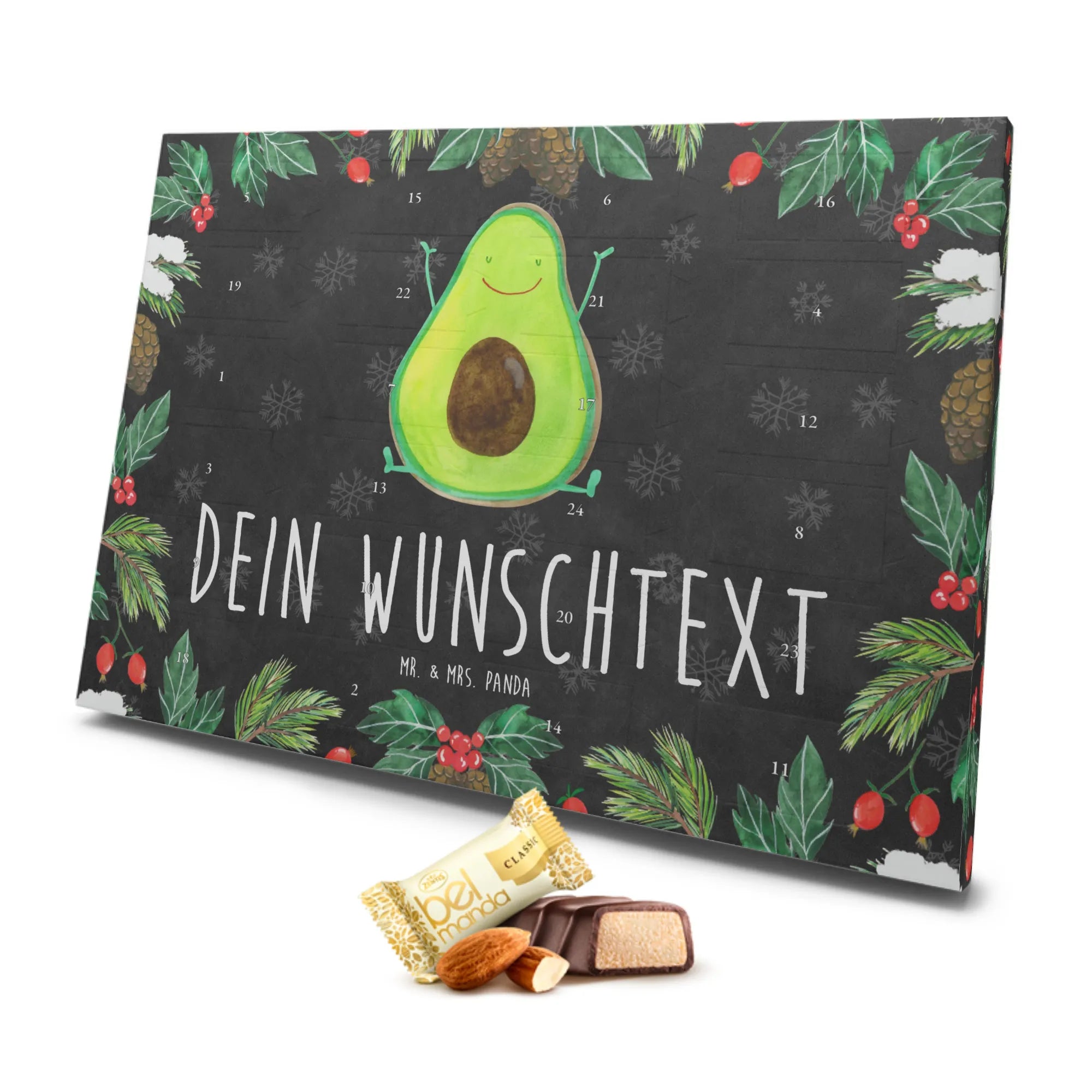 Entdecke den wundervollen personalisierten Marzipan Adventskalender Avocado Happy von Mr. & Mrs. Panda, der nicht nur deine Weihnachtszeit verzaubert, sondern auch eine fröhliche Überraschung für dich oder deine Lieben bereithält! Mit einem strahlenden Avocado-Motiv, das fröhlich die Arme nach oben hebt, bringt dieser Adventskalender Freude und das gewisse Etwas in dein festliches Zuhause.
