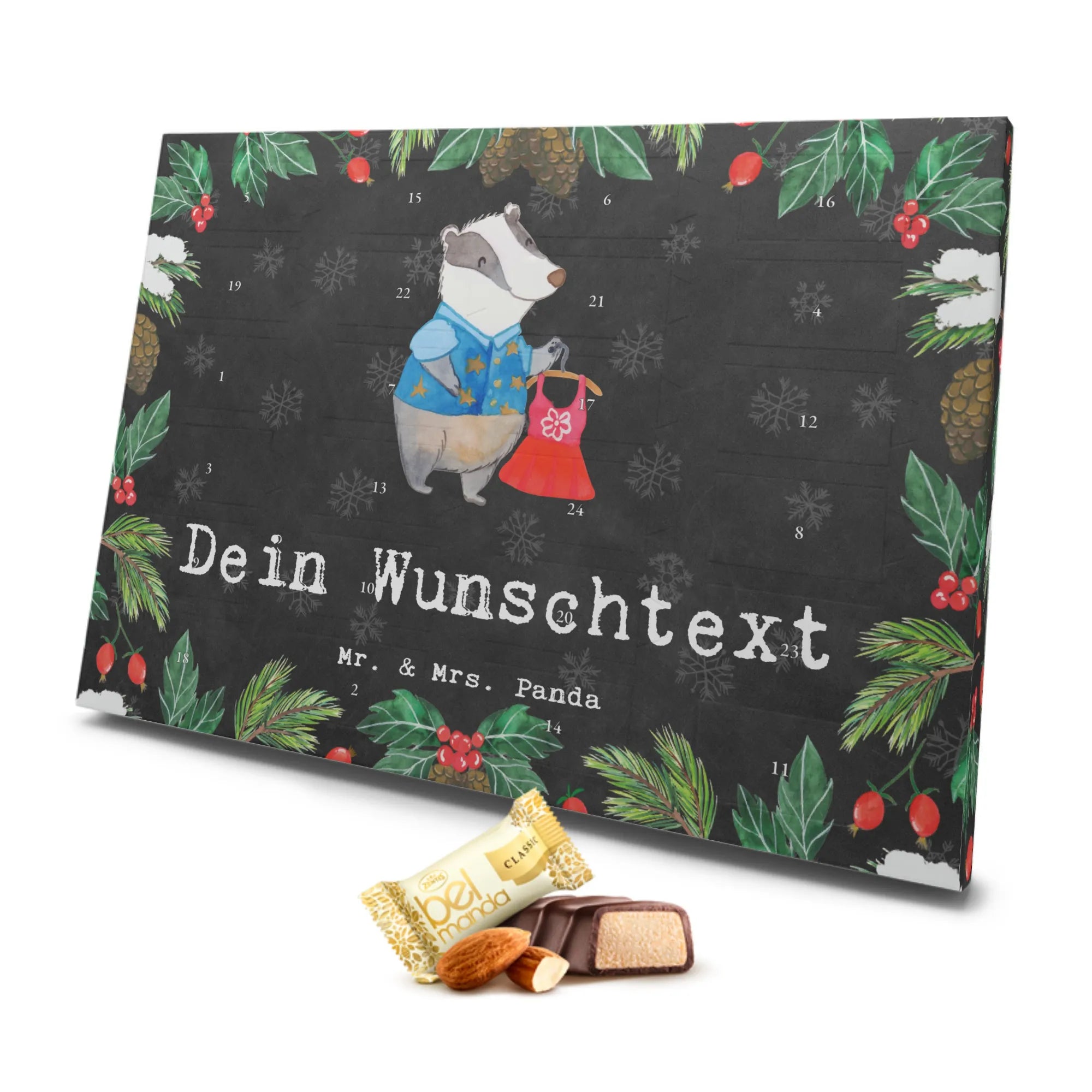 Befüllt mit 24 einzeln verpackten Edelmarzipan Pralinés ist jeder Tag eine süße Überraschung. Der charmante Dachs, der in schickem Gewand ein tolles Kleid präsentiert, verleiht diesem Kalender einen witzigen und kreativen Touch. Der Kalender ist nicht nur ein Highlight für die Geschmacksknospen, sondern auch ein persönliches Geschenk, das durch die Möglichkeit der Personalisierung mit deinem Wunschtext noch individueller gemacht werden kann.