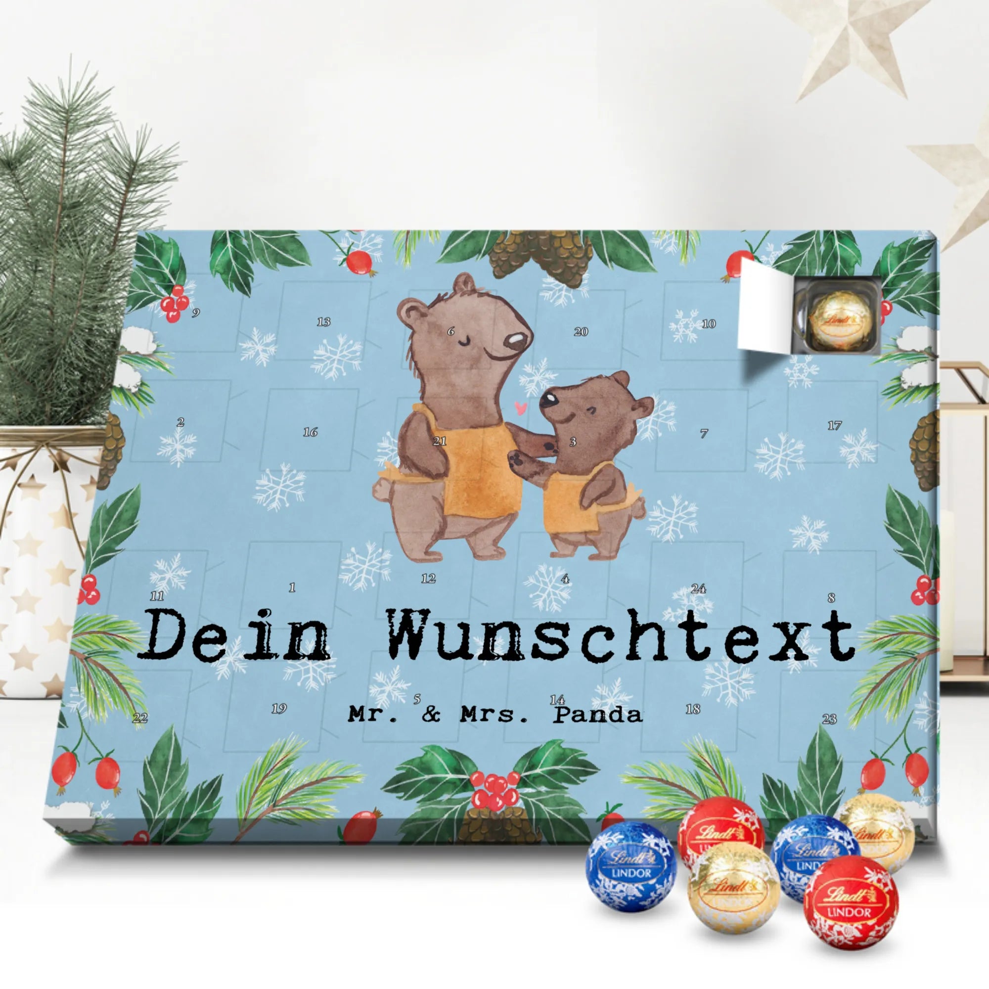 Personalisierter Schokoladen Adventskalender von Mr. & Mrs. Panda – perfekt für alle, die es süß und persönlich mögen. Unser Adventskalender ist mit liebevollen Illustrationen und charmanten Sprüchen von Mr. & Mrs. Panda bedruckt und kann mit deinem Namen oder Wunschtext individualisiert werden. Die brillante Druckqualität und die seidenmatte Oberflächenveredelung sorgen für ein edles Erscheinungsbild, zudem sind die Seitenflächen bedruckt. Maße: 233 mm x 178 mm x 24 mm. Du kannst den Kalender aufstellen oder aufhängen – je nachdem, wie du ihn am schönsten präsentierst. Gefüllt mit Lindt Lindor Schokolade: 24 einzeln verpackte Markenschokoladen Kugeln in drei köstlichen Sorten. Geschmacksrichtungen: Vollmilch, Feinherb und Weiße Schokolade. Zutaten: Zucker, pflanzliches Fett (Kokosnuss, Palmkern), Kakaobutter, Vollmilchpulver, Kakaomasse, Milchzucker, Magermilchpulver, Butterreinfett, Emulgator (Sojalecithin), Gerstenmalzextrakt, Aromen. Besondere Hinweise: Kann Haselnüsse und Mandeln enthalten. Ob als Advents-Überraschung für deine Liebsten oder als kleines Geschenk für Kollegen – dieser Kalender bringt personalisierten Genuss in die Vorweihnachtszeit.