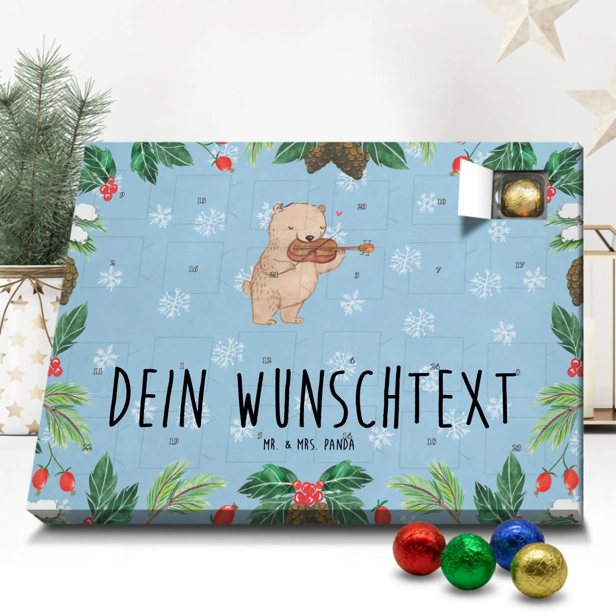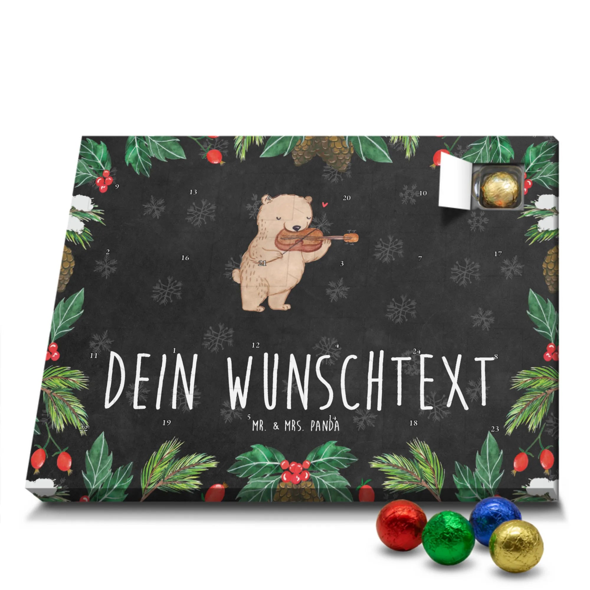 Du suchst einen besonderen Adventskalender? Unser Personalisierter Schoko-Adventskalender von Mr. & Mrs. Panda ist perfekt für dich! Er ist liebevoll gestaltet, mit vielen süßen Motiven und kurzen Sprüchen bedruckt und lässt sich ganz individuell mit deinem Wunschnamen oder einem Wunschtext personalisieren. Die hochwertige Bedruckung erhält durch eine seidenmatte Veredelung einen edlen Look, und auch die Seitenflächen sind komplett bedruckt – so wirkt der Kalender von vorne bis hinten durchgestylt. Maße: 233 mm x 178 mm x 24 mm. Eine tolle Besonderheit: Du kannst ihn aufstellen oder an die Wand hängen, je nachdem, wo er bei dir am besten zur Geltung kommt. Gefüllt ist der Kalender mit MARKENNAMEN Schokolade sowie leckeren Schokoladenkugeln für echte Genießer. Bitte beachten: (Kann Spuren von Haselnüssen, Mandeln, Gluten und Soja enthalten!), kühl und trocken lagern! Ob als Geschenk für Freunde oder als personalisierte Überraschung für dich selbst – dieser Kalender bringt Freude und süße Momente in die Vorweihnachtszeit. Hol ihn dir und gestalte deinen Advent mit persönlicher Note und liebevollen Panda-Motiven.