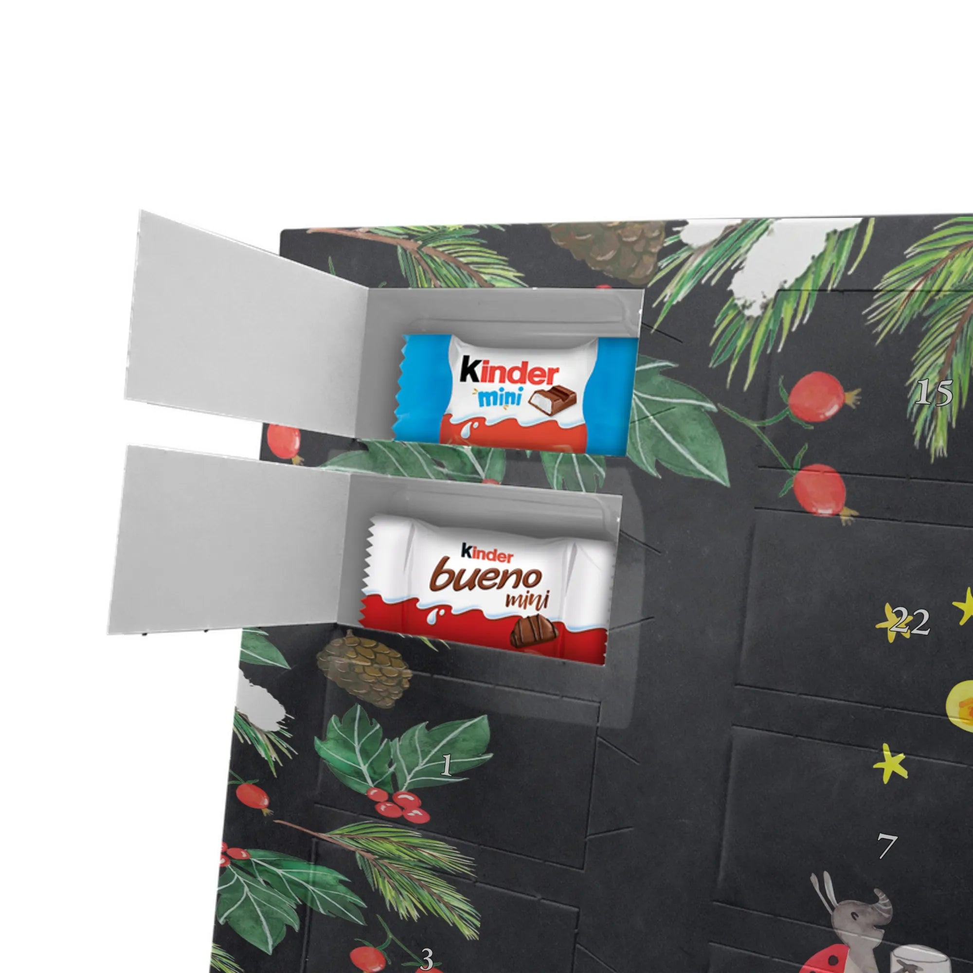 Feier die Vorfreude mit einem persönlichen Hingucker: unser Personalisierter Schoko Adventskalender von Mr. & Mrs. Panda. Dieser Kalender ist liebevoll mit wunderschönen Motiven & Sprüchen bedruckt und kann mit deinem Wunschnamen oder Wunschtext individualisiert werden – perfekt für eine persönliche Überraschung jeden Adventstag. Die brillante Druckqualität und die seidenmatte Oberflächenveredelung geben dem Kalender einen edlen Look, und die bedruckten Seitenflächen machen ihn rundum dekorativ. Besonders praktisch: der Kalender kann aufgehängt oder aufgestellt werden, je nachdem, wie du ihn präsentieren möchtest. Maße: 355 mm x 245 mm x 11 mm – ein ideales Format für dekorative Platzierung und genügend Raum für leckere Türchenüberraschungen. Gefüllt mit kinder® Schokolade: Adventskalender gefüllt mit kinder® Schokolade; Inhalt: kinder® Schoko-Bons, kinder® Bueno mini und kinder® Schokolade mini. Ob als Geschenk für Kinder, Partner oder beste Freunde – mit Mr. & Mrs. Panda verschenkst du nicht nur Süßes, sondern echte Vorfreude und liebevolle Gestaltung.