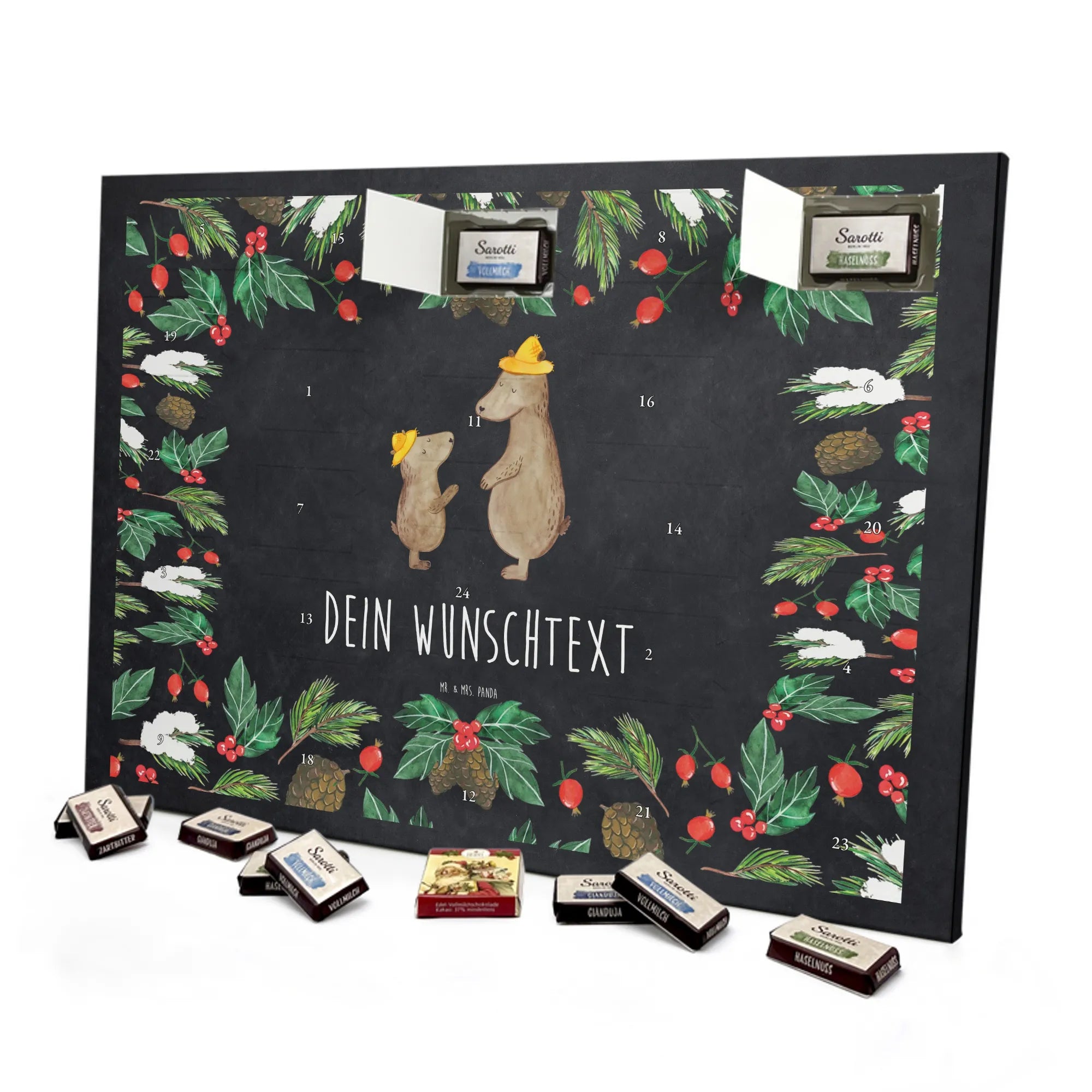 🐼 PERSONALISIERTER SCHOKO-ADVENTSKALENDER: Mit Wunschtext, bedruckt mit Mr. & Mrs. Panda Motiven, gefüllt mit MARKENNAMEN Schokolade.