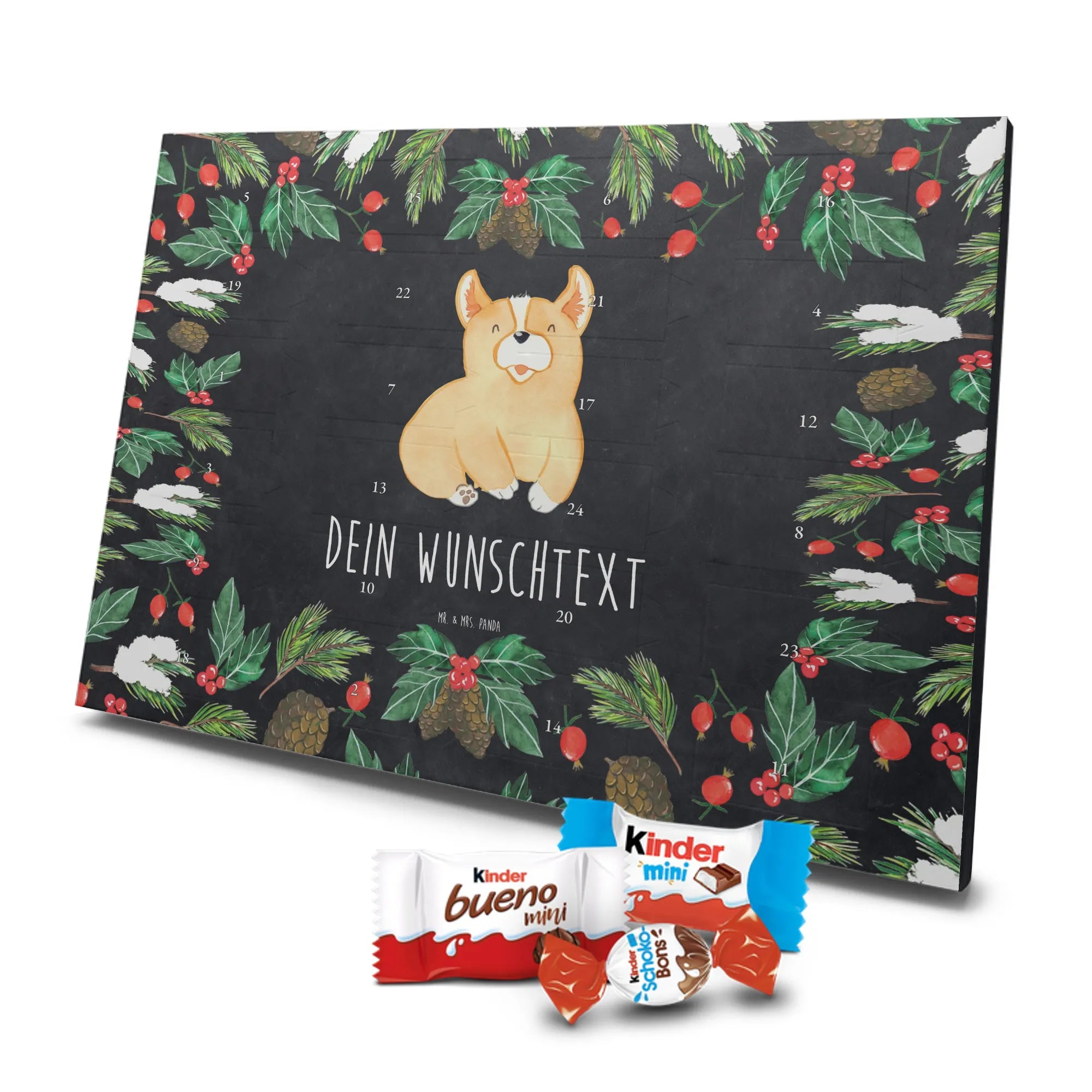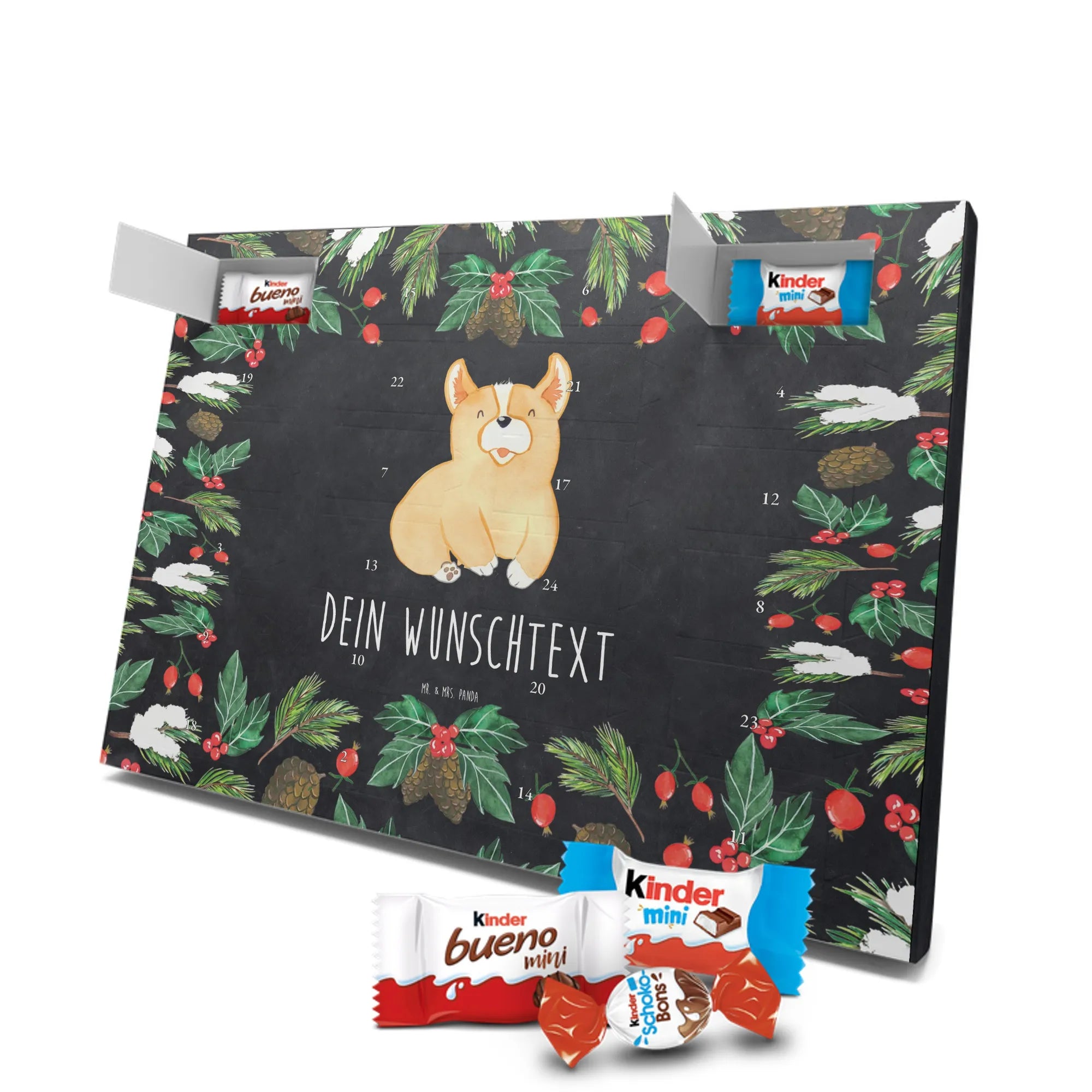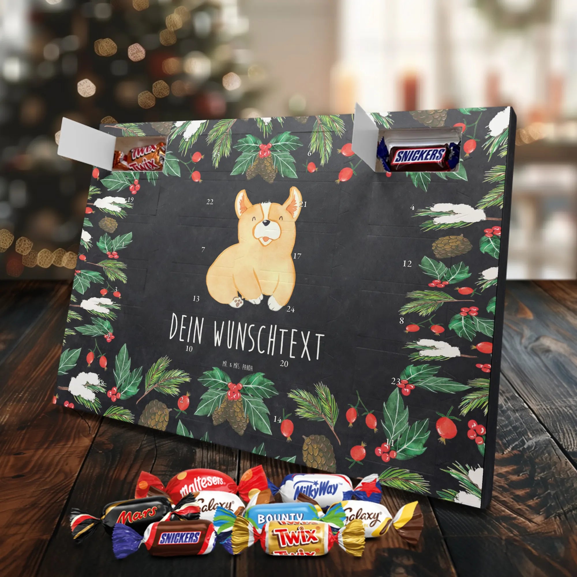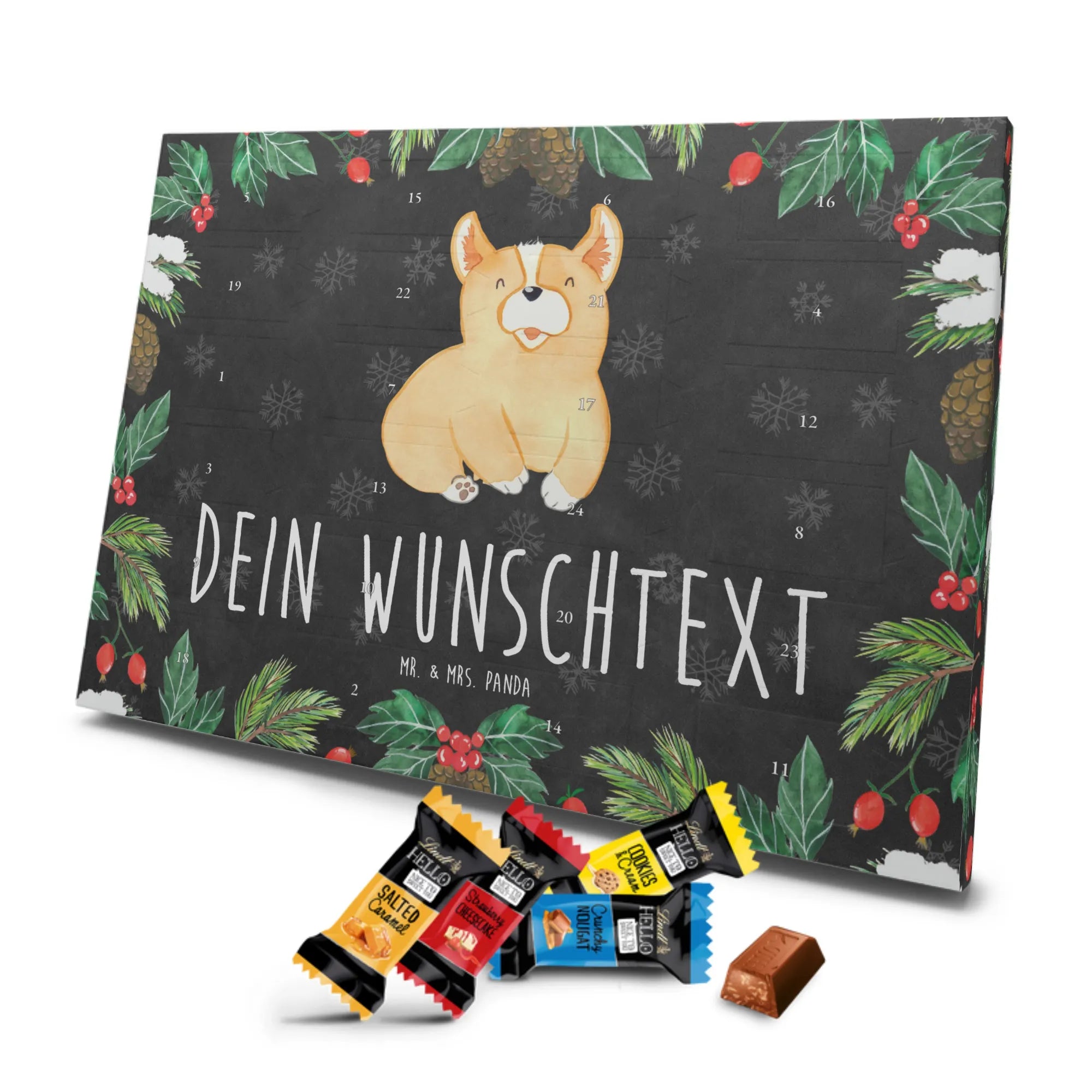 Adventskalender mit deinem Namen – individuell, süß und mit ganz viel Mr. & Mrs. Panda Charme! Dieser personalisierbare Schoko Adventskalender wird mit liebevollen Motiven & frechen Sprüchen bedruckt und lässt sich mit deinem Wunschnamen oder Wunschtext individualisieren. Durch die brillante Druckqualität und die seidenmatte Oberflächenveredelung wirken die Farben besonders intensiv und hochwertig. Auch die Seitenflächen sind bedruckt, sodass das Gesamtbild stimmig ist. Du hast die Wahl: Häng den Kalender auf oder stell ihn auf – beides funktioniert super. Der Kalender ist gefüllt mit Celebrations und enthält 24 hochwertige Füllungen in 8 verschiedenen Sorten, darunter Maltesers, Mars, Snickers, Twix, Milky Way, Bounty, Galaxy und Galaxy Caramel, die dir jeden Tag im Dezember ein Lächeln schenken. Maße: 325 mm x 225 mm x 27 mm – ideal dimensioniert für schöne Türchen-Überraschungen. Verschenke persönliche Vorfreude an Freunde, Familie oder gönn dir selbst diese zuckersüße Adventsüberraschung von Mr. & Mrs. Panda.