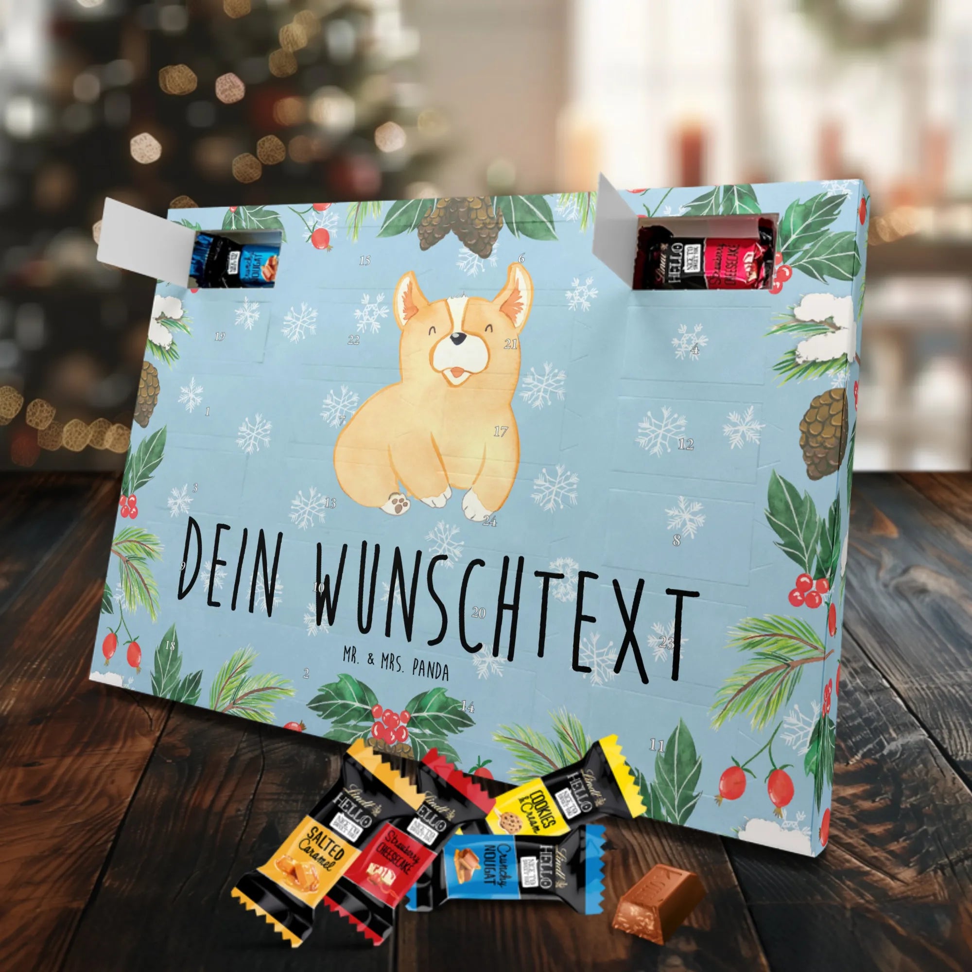 Schoko Adventskalender personalisiert – die süße Überraschung von Mr. & Mrs. Panda für die Adventszeit! Unser Kalender ist liebevoll illustriert und mit fröhlichen Sprüchen bedruckt, die du zusätzlich mit deinem Wunschnamen oder einem kurzen Text personalisieren kannst. Die Seitenflächen sind ebenfalls bedruckt, sodass das Design rundum harmonisch ist. Durch die seidenmatte Oberflächenveredelung wirkt alles besonders hochwertig und die brillante Druckqualität setzt deine Motive toll in Szene. Der Kalender kann entweder aufgestellt oder aufgehängt werden und passt damit in jede Dekoration. Gefüllt mit Lindt Hello: Du bekommst 24 einzeln verpackte Schokoladen Mini Sticks in vier verschiedenen Geschmacksrichtungen (Karamell-Schokoladenkuchen, Kekse, Knuspriger Nougat, Erdbeer-Cheesecake). Zutatenliste inklusive. Wichtige Allergenhinweise: enthält Milcheiweiß, Milchzucker, Soja, Weizen und Haselnüsse; kann Mandeln und andere Schalenfrüchte enthalten. Ein persönliches Geschenk mit Qualität und Herz – gemacht für schöne Adventsmomente. Maße: 325 mm x 225 mm x 27 mm.