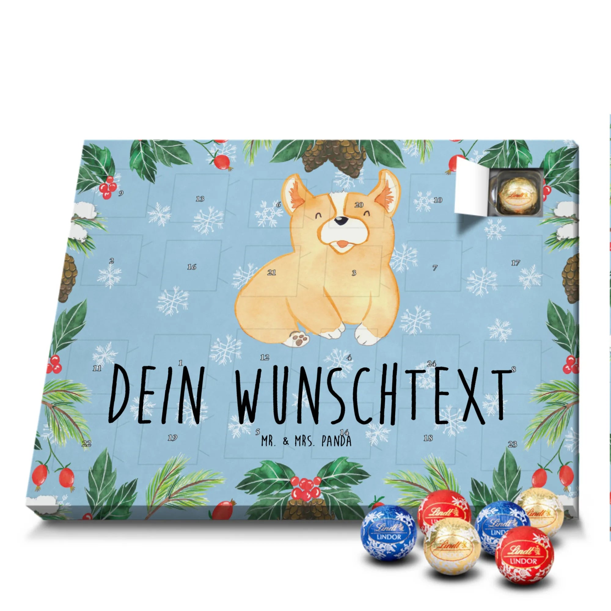 Personalisierter Schokoladen Adventskalender von Mr. & Mrs. Panda – perfekt für alle, die es süß und persönlich mögen. Unser Adventskalender ist mit liebevollen Illustrationen und charmanten Sprüchen von Mr. & Mrs. Panda bedruckt und kann mit deinem Namen oder Wunschtext individualisiert werden. Die brillante Druckqualität und die seidenmatte Oberflächenveredelung sorgen für ein edles Erscheinungsbild, zudem sind die Seitenflächen bedruckt. Maße: 233 mm x 178 mm x 24 mm. Du kannst den Kalender aufstellen oder aufhängen – je nachdem, wie du ihn am schönsten präsentierst. Gefüllt mit Lindt Lindor Schokolade: 24 einzeln verpackte Markenschokoladen Kugeln in drei köstlichen Sorten. Geschmacksrichtungen: Vollmilch, Feinherb und Weiße Schokolade. Zutaten: Zucker, pflanzliches Fett (Kokosnuss, Palmkern), Kakaobutter, Vollmilchpulver, Kakaomasse, Milchzucker, Magermilchpulver, Butterreinfett, Emulgator (Sojalecithin), Gerstenmalzextrakt, Aromen. Besondere Hinweise: Kann Haselnüsse und Mandeln enthalten. Ob als Advents-Überraschung für deine Liebsten oder als kleines Geschenk für Kollegen – dieser Kalender bringt personalisierten Genuss in die Vorweihnachtszeit.