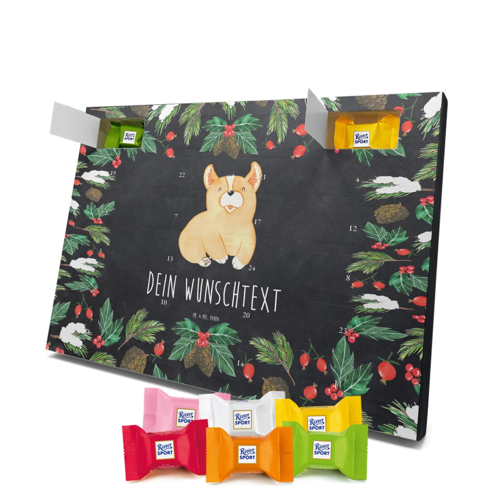 Suchst du einen besonderen Adventskalender, der persönlich und hochwertig ist? Unser Adventskalender mit Namen von Mr. & Mrs. Panda ist genau das – individualisierbar mit dem Namen deiner Liebsten oder einem kurzen Spruch und bedruckt mit unseren beliebten, charmanten Motiven. Die Druckqualität ist brillant, die seidenmatte Oberflächenveredelung verleiht dem Kalender eine elegante Haptik. Auch die Seitenflächen sind liebevoll bedruckt, sodass das Design rundum überzeugt. Du kannst den Kalender aufstellen oder an einer Stelle aufhängen, die du magst – die besondere Form macht beides möglich. Gefüllt ist der Kalender mit Ritter Sport Schokowürfeln in sechs beliebten Sorten: Mousse au Chocolat, Schoko Crisp, Voll-Nuss in Nougatcreme, Karamell Duo, Joghurt und Erdbeer-Joghurt. So gibt es hinter jedem Türchen eine kleine, leckere Überraschung. Maße: 325 mm x 225 mm x 27 mm – kompakt genug, um überall Platz zu finden, groß genug für 24 sorgfältig verpackte Schokowürfel.