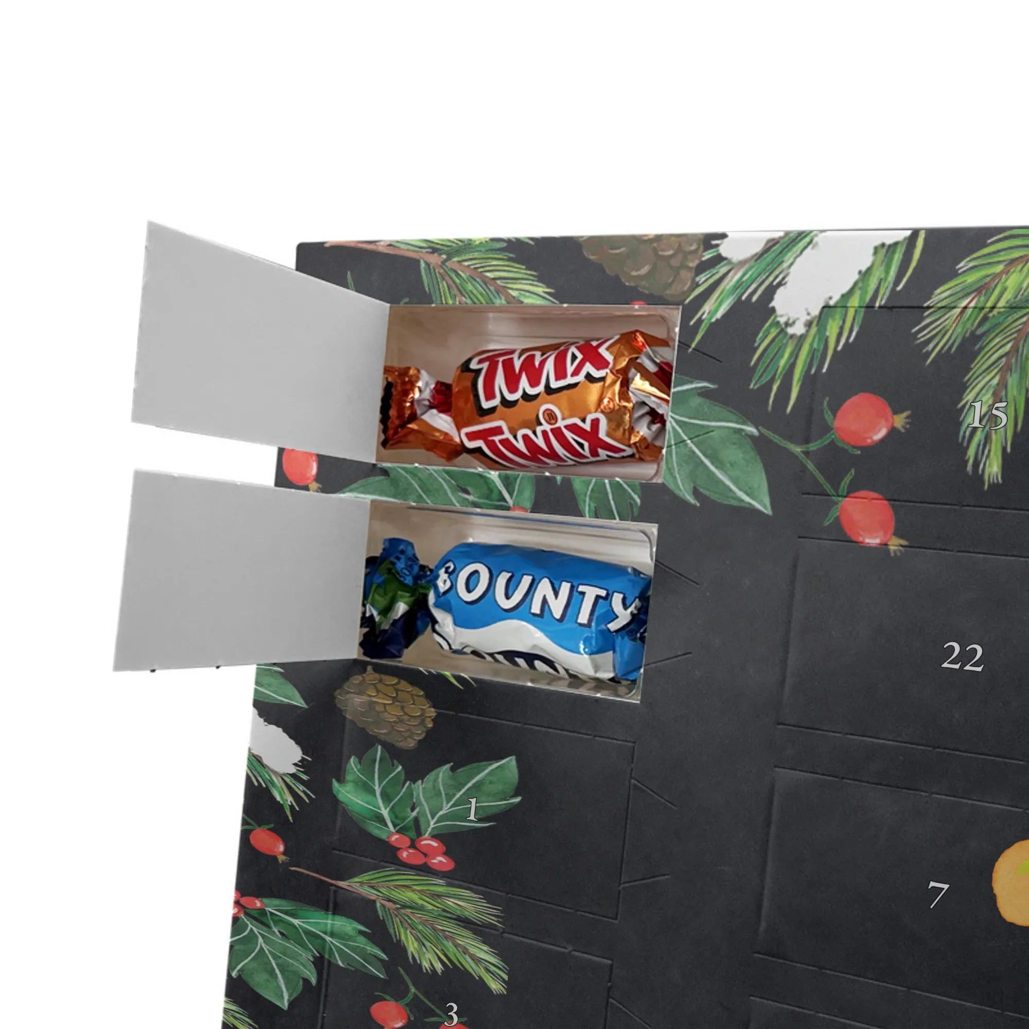 Personalisierter Schoko-Adventskalender von Mr. & Mrs. Panda – liebevoll gestaltet und ideal als individuelles Geschenk in der Adventszeit. Wir bedrucken den Kalender mit zauberhaften Motiven & herzlichen Sprüchen und personalisieren ihn mit deinem Wunschnamen oder Wunschtext. Die hochwertige Druckqualität kombiniert mit einer seidenmatten Oberflächenveredelung sorgt für ein edles Erscheinungsbild, und die bedruckten Seitenflächen geben dem Motiv zusätzlichen Charme. Der Kalender kann aufgehängt oder aufgestellt werden, sodass du ihn flexibel platzieren kannst. Gefüllt ist der Kalender mit Celebrations, die 24 hochwertige Überraschungen in 8 verschiedenen Sorten beinhalten: Maltesers, Mars, Snickers, Twix, Milky Way, Bounty, Galaxy und Galaxy Caramel. Maße: 325 mm x 225 mm x 27 mm – handlich und doch großzügig für die kleinen Leckereien hinter den Türchen. Ob für Kinder, Partner oder beste Freunde: dieser personalisierte Schoko-Adventskalender macht das Warten auf Weihnachten bunter und leckerer. Verschenke eine persönliche Erinnerung und jeden Tag ein kleines Schokoladen-Glück!
