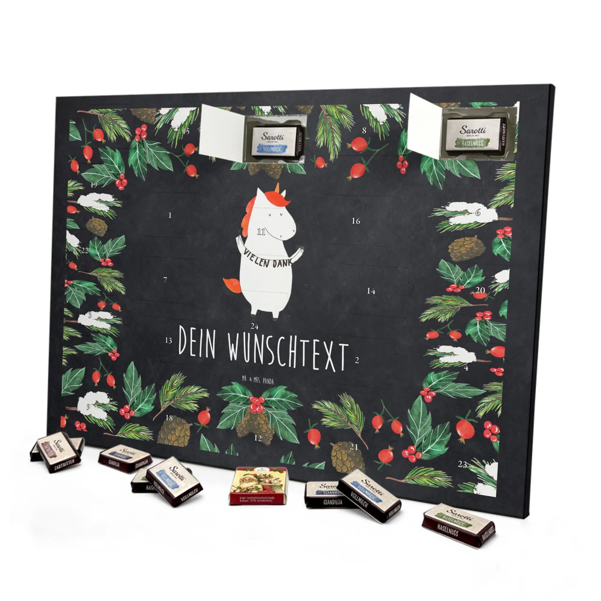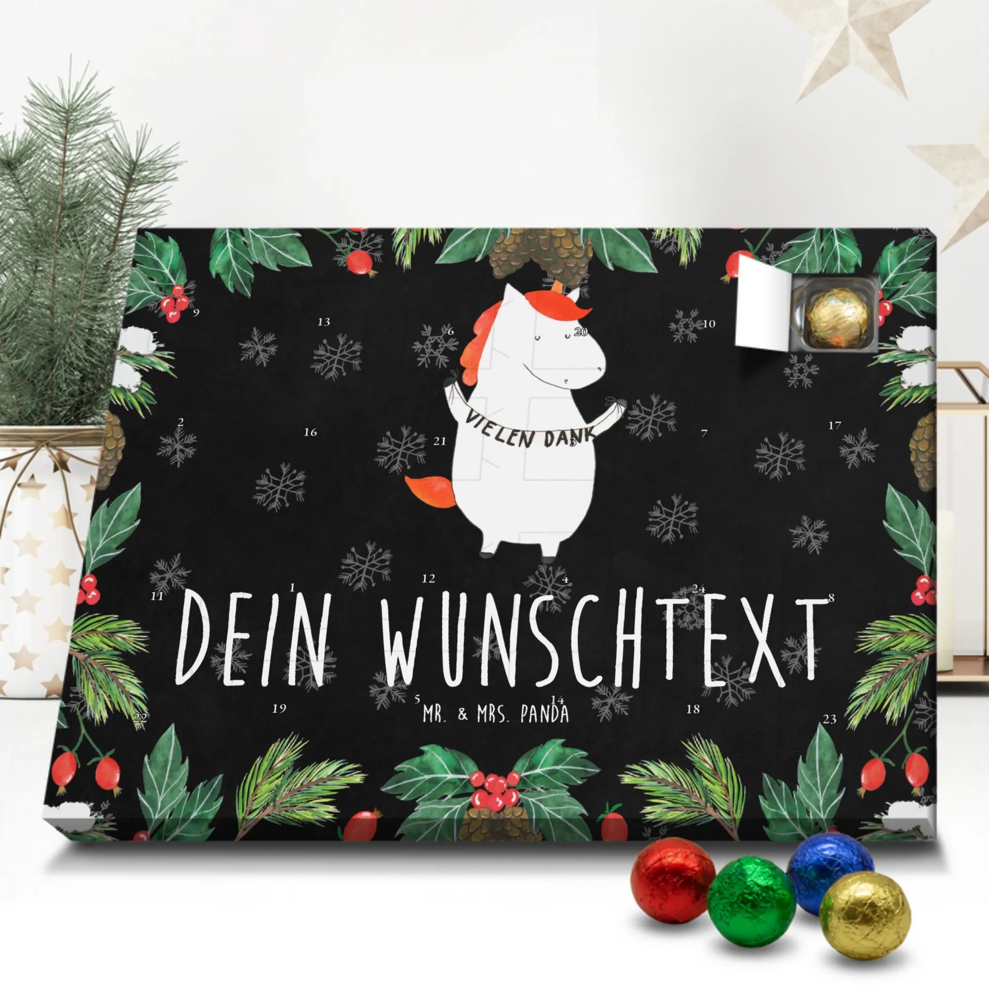 Mit unserem Personalisierter Schoko Adventskalender Einhorn „Vielen Dank“ aus der Einhorn - Kollektion von Mr. & Mrs. Panda schenkst Du nicht nur Schokolade, sondern vor allem Aufmerksamkeit und Herzlichkeit. Das niedliche Einhorn mit Girlande wurde liebevoll von Mrs. Panda per Aquarell handgezeichnet und ist in brillanter Druckqualität auf einem kreidetafel-farbenen Hintergrund gedruckt. Der dezente Text „hier kein pruch, hier nur das Motiv - " ergänzt das Design auf charmante Weise.