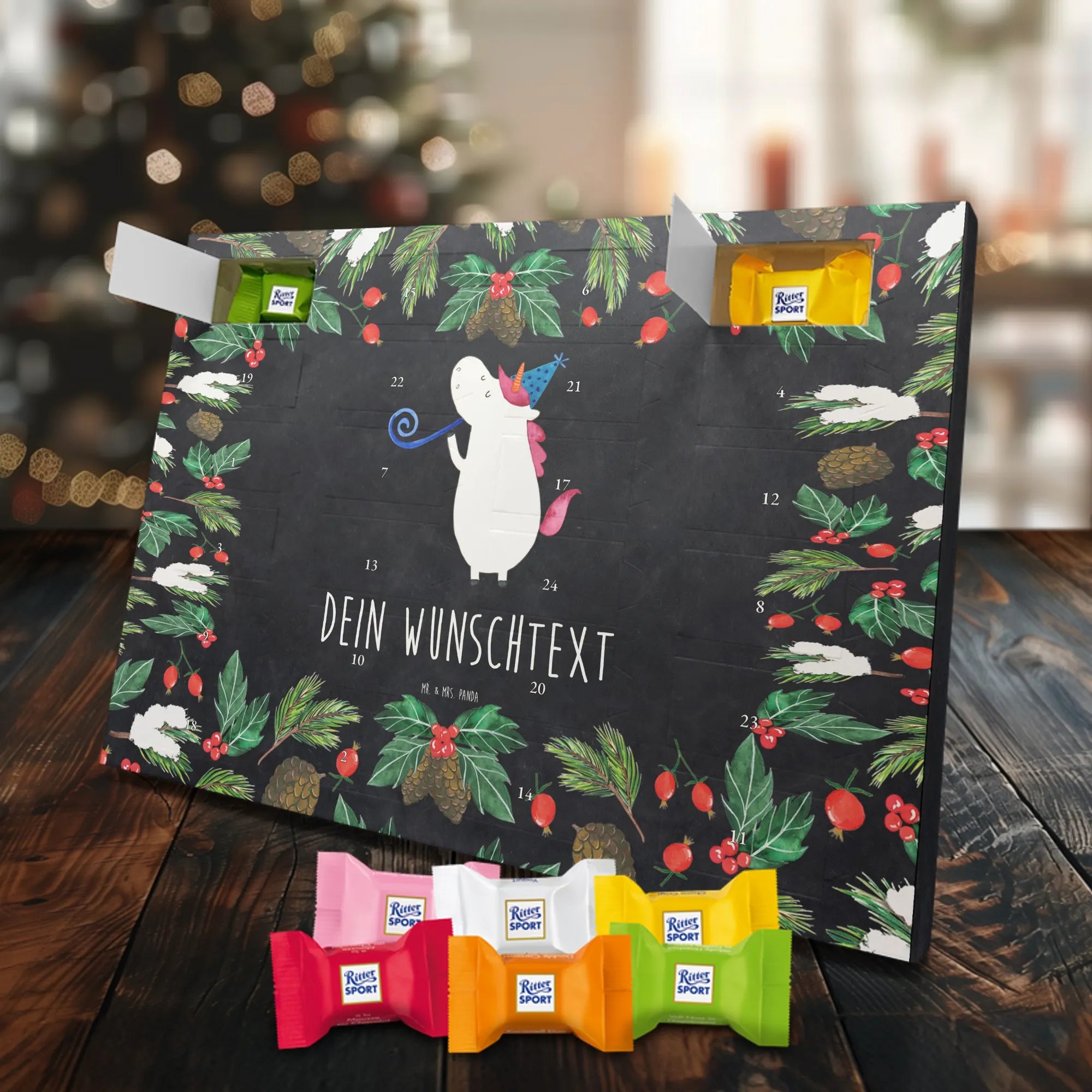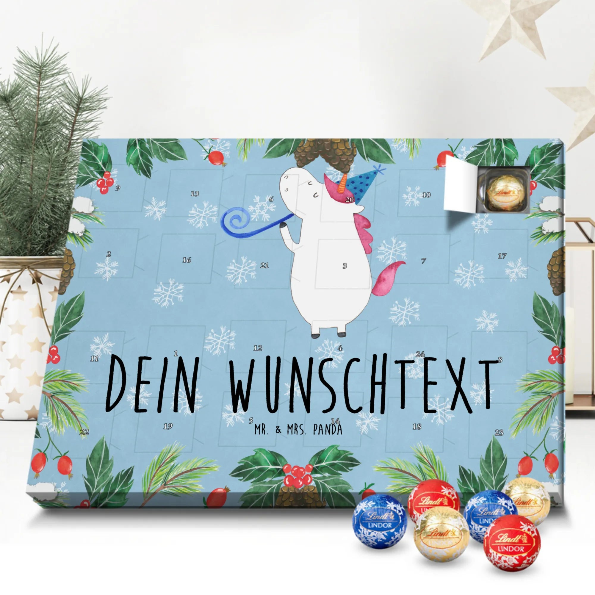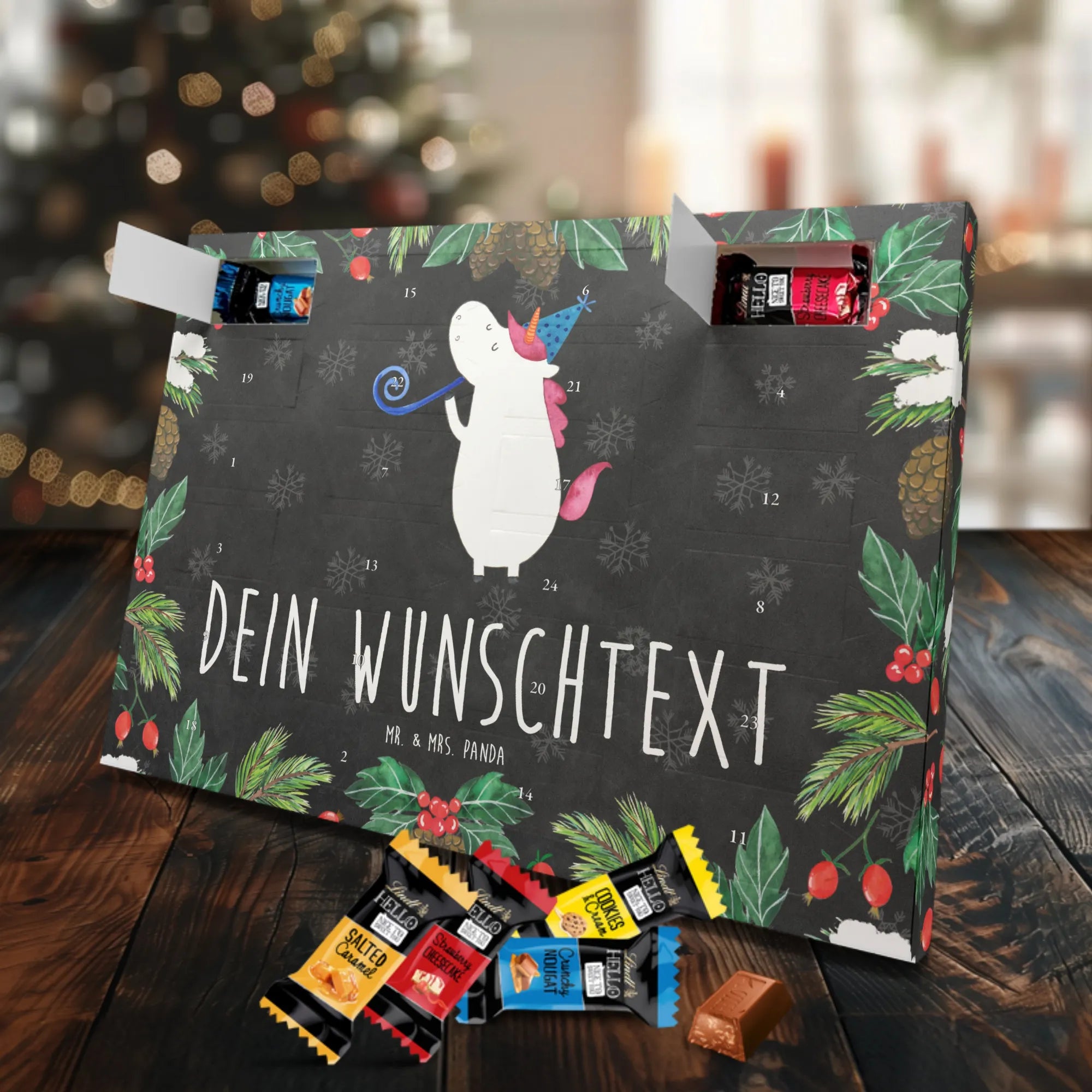 Verschenke Vorfreude, Persönlichkeit und Schokolade – mit dem Personalisierbaren Adventskalender „Einhorn Party“ von Mr. & Mrs. Panda. 🥳