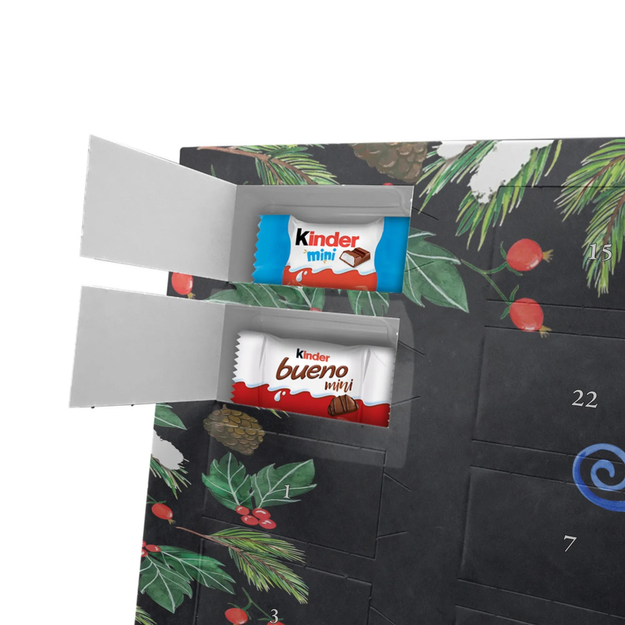 Der Kalender ist personalisierbar mit deinem Wunschname – so wird er zum persönlichen Geschenk für Freundin, Kollegin, Trauzeugin oder Partyfreund. Gefüllt mit kinder® Schokolade, inklusive kinder® Schoko-Bons, kinder® Bueno mini und kinder® Schokolade mini, bietet er täglich kleine Genussmomente bis Weihnachten.