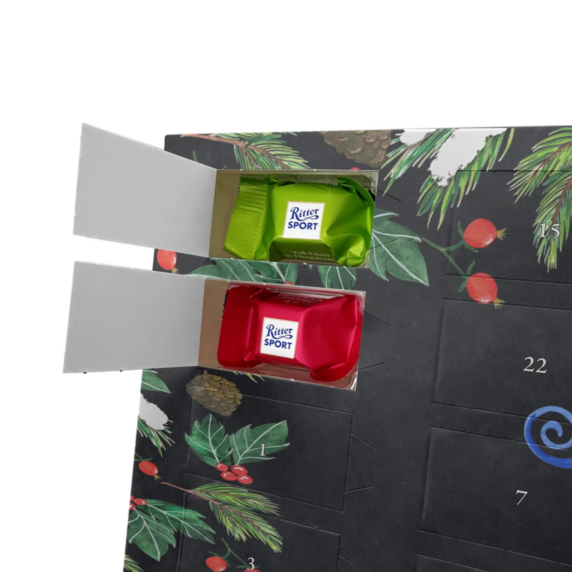 🐼 24 Türchen mit Ritter Sport Schokowürfeln in beliebten Sorten.