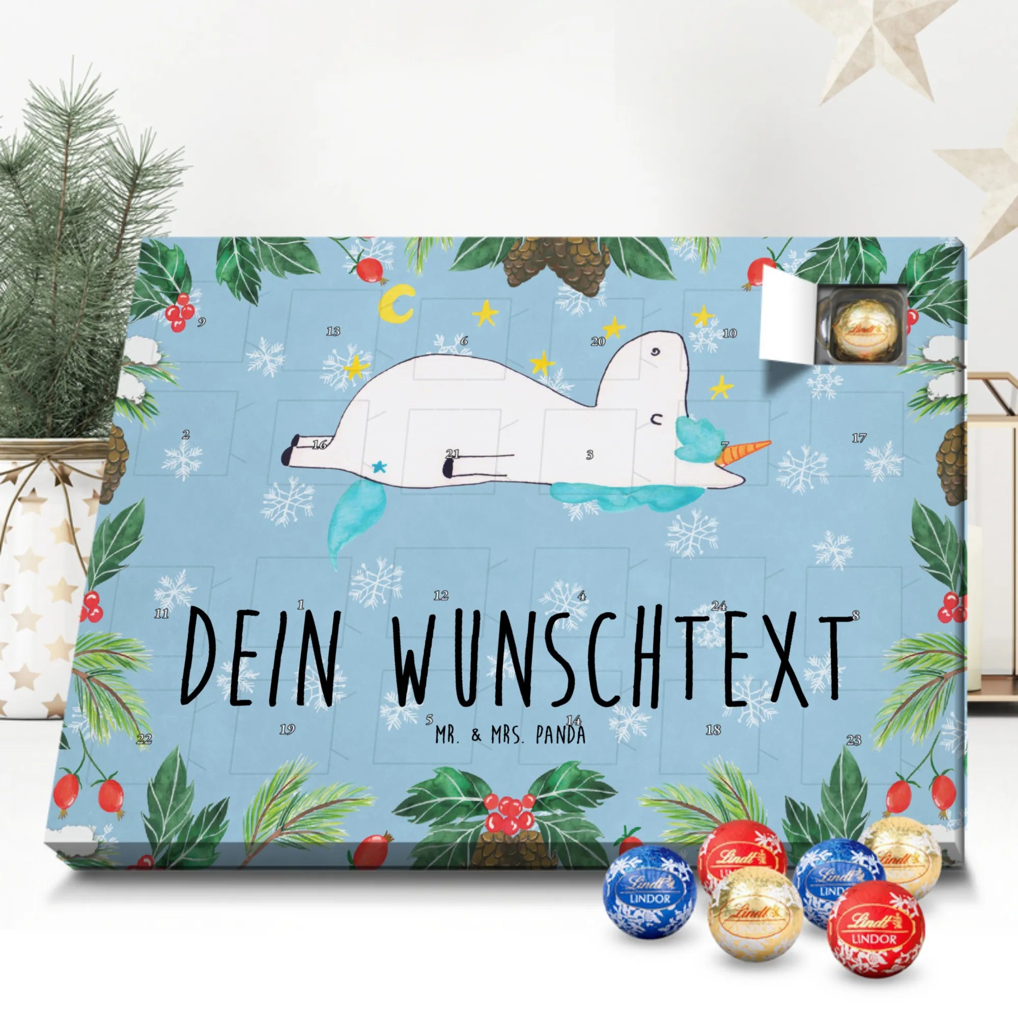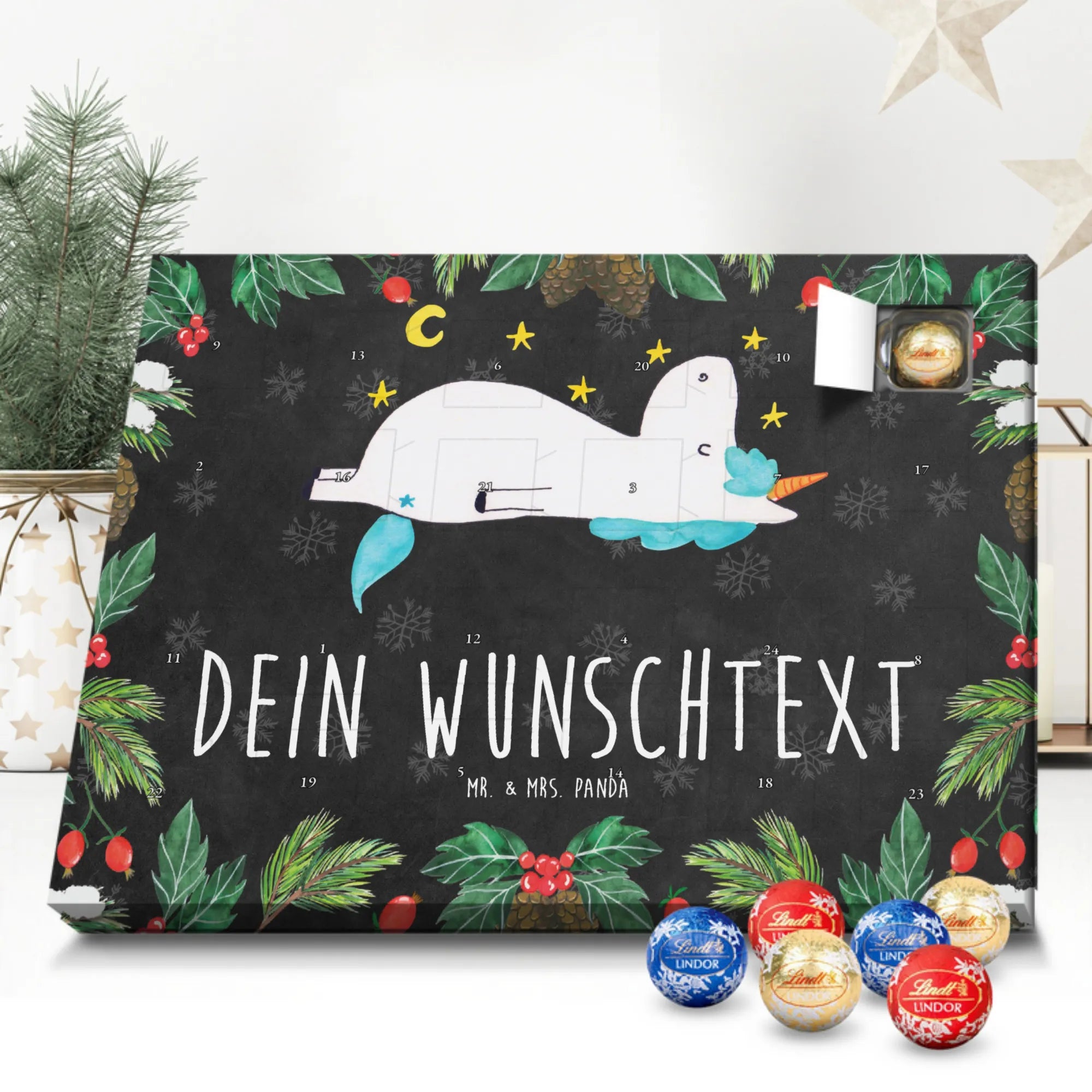Personalisierter Schokoladen Adventskalender von Mr. & Mrs. Panda – perfekt für alle, die es süß und persönlich mögen. Unser Adventskalender ist mit liebevollen Illustrationen und charmanten Sprüchen von Mr. & Mrs. Panda bedruckt und kann mit deinem Namen oder Wunschtext individualisiert werden. Die brillante Druckqualität und die seidenmatte Oberflächenveredelung sorgen für ein edles Erscheinungsbild, zudem sind die Seitenflächen bedruckt. Maße: 233 mm x 178 mm x 24 mm. Du kannst den Kalender aufstellen oder aufhängen – je nachdem, wie du ihn am schönsten präsentierst. Gefüllt mit Lindt Lindor Schokolade: 24 einzeln verpackte Markenschokoladen Kugeln in drei köstlichen Sorten. Geschmacksrichtungen: Vollmilch, Feinherb und Weiße Schokolade. Zutaten: Zucker, pflanzliches Fett (Kokosnuss, Palmkern), Kakaobutter, Vollmilchpulver, Kakaomasse, Milchzucker, Magermilchpulver, Butterreinfett, Emulgator (Sojalecithin), Gerstenmalzextrakt, Aromen. Besondere Hinweise: Kann Haselnüsse und Mandeln enthalten. Ob als Advents-Überraschung für deine Liebsten oder als kleines Geschenk für Kollegen – dieser Kalender bringt personalisierten Genuss in die Vorweihnachtszeit.