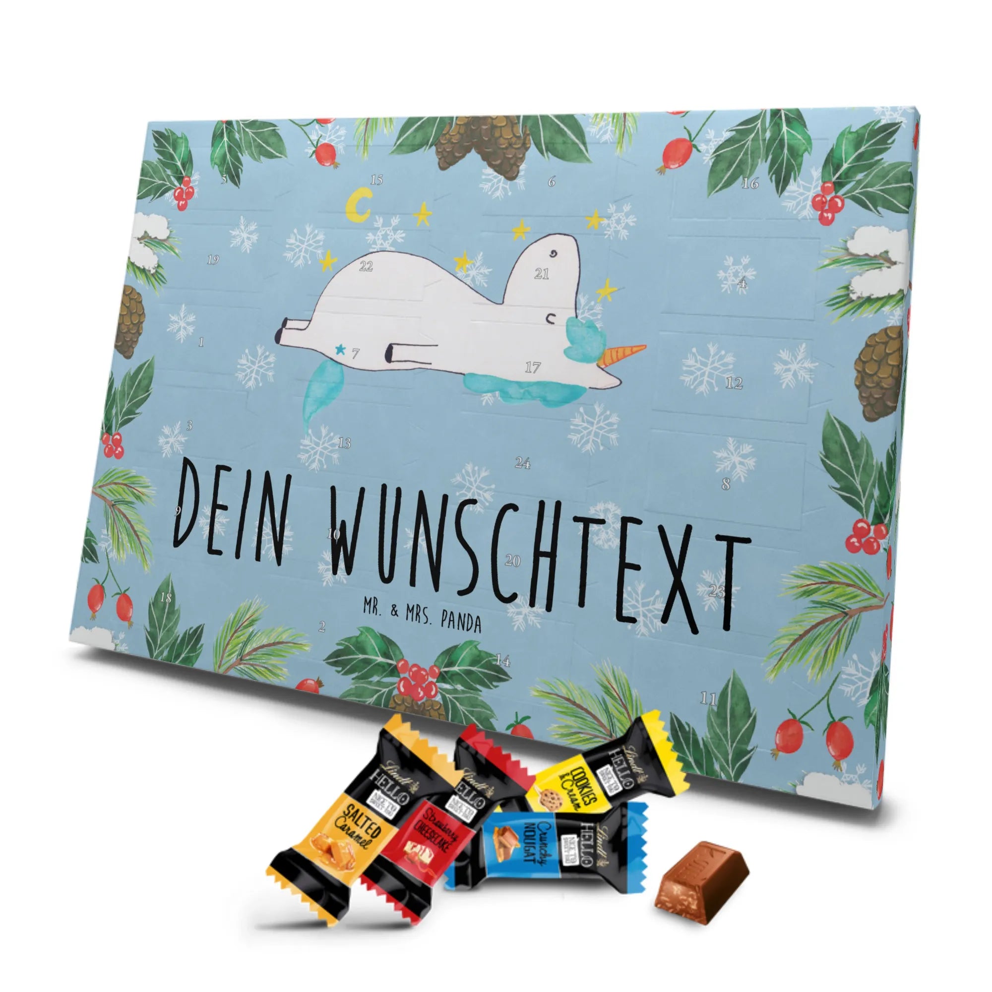Personalisierter Adventskalender mit Schokolade – das Geschenk, das von Herzen kommt. Mr. & Mrs. Panda haben für dich einen Adventskalender gestaltet, der nicht nur mit süßen Überraschungen gefüllt ist, sondern auch optisch überzeugt: bedruckte Seitenflächen, charmante Motive und Sprüche sowie eine seidenmatte Oberflächenveredelung für edles Finish. Du kannst den Kalender mit deinem Wunschnamen oder Wunschtext personalisieren – ideal als Geschenk für die beste Freundin, Familie oder Kinder. Er kann aufgehängt oder einfach aufgestellt werden, je nachdem, wie du ihn präsentieren möchtest. Gefüllt mit Lindt Hello: 24 einzeln verpackte Schokoladen Mini Sticks in den Sorten Karamell-Schokoladenkuchen, Kekse, Knuspriger Nougat und Erdbeer-Cheesecake. Bitte beachte die Zutaten und Allergenhinweise (Milcheiweiß, Milchzucker, Soja, Weizen, Haselnüsse; kann Mandeln und andere Schalenfrüchte enthalten). Die brillante Druckqualität macht dein Design besonders lebendig. Maße: 325 mm x 225 mm x 27 mm – handliche Größe für jede Dekoration.
